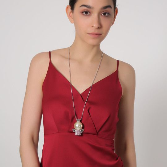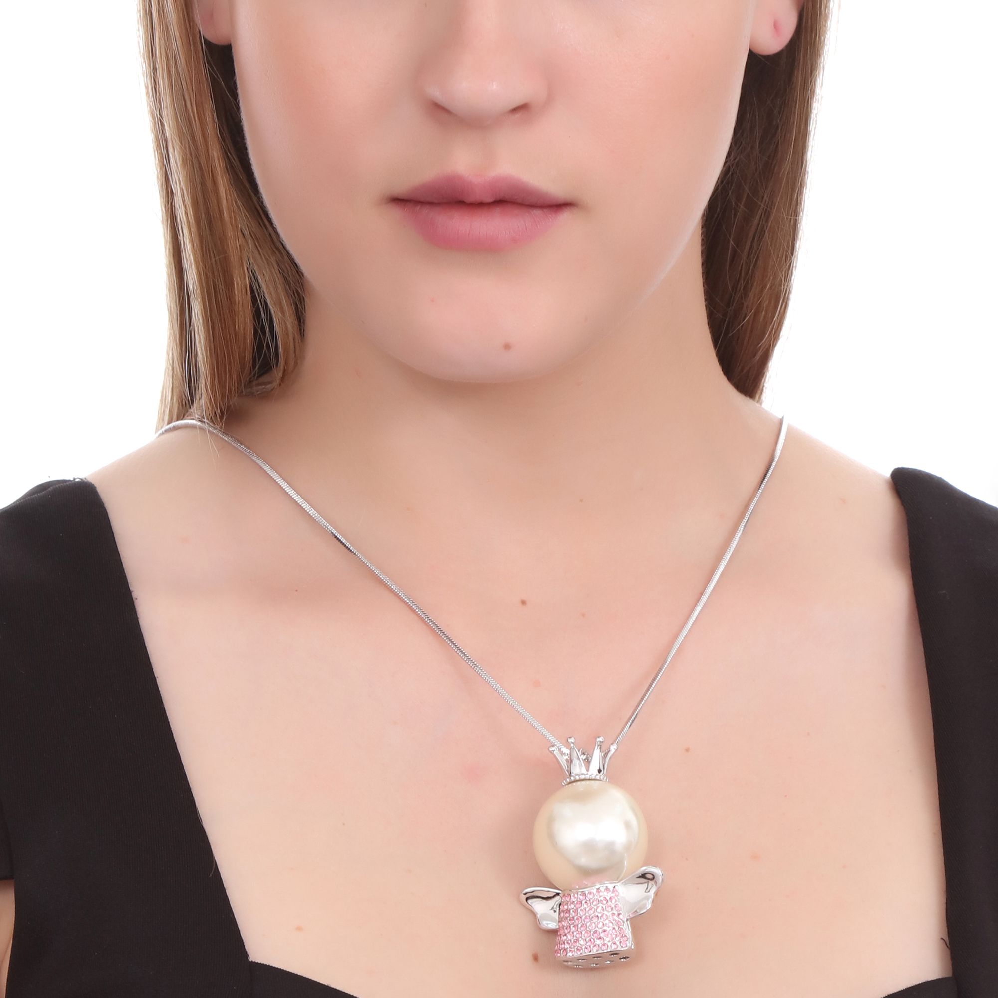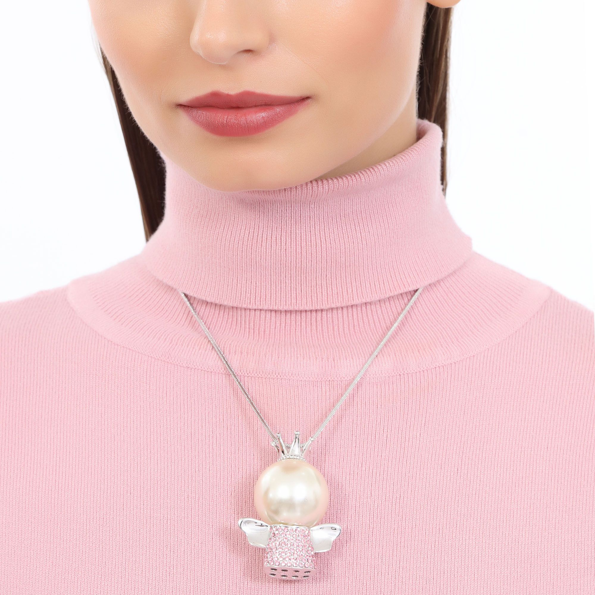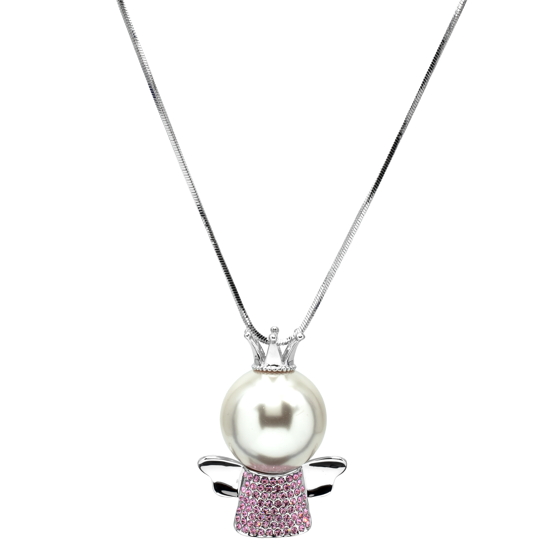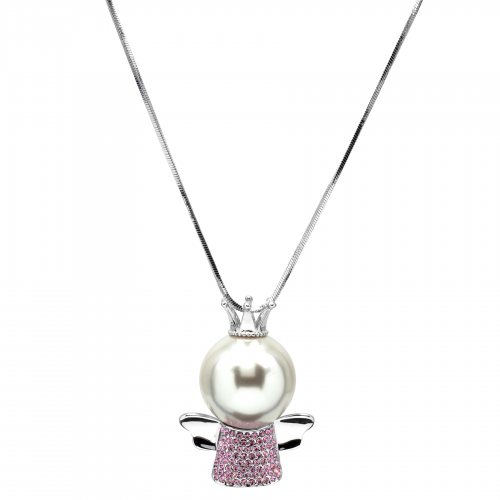 Collar en baño de oro blanco de 18 quilates, diseño de ángel con cristales en color rosa y perla de cristal.