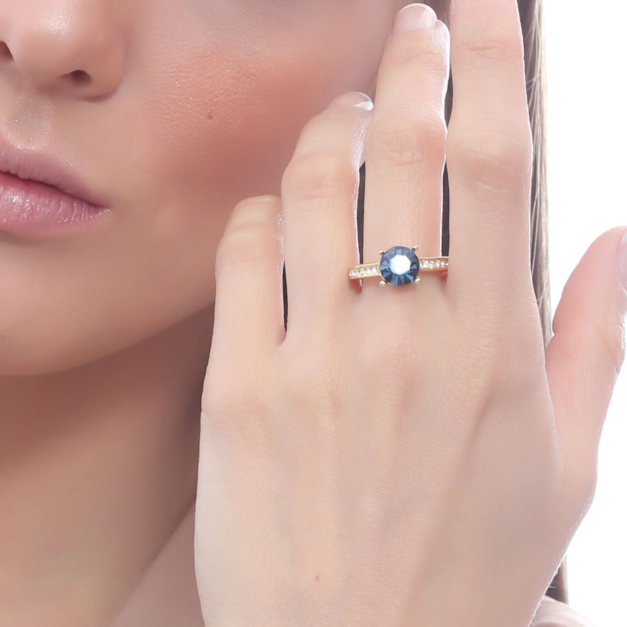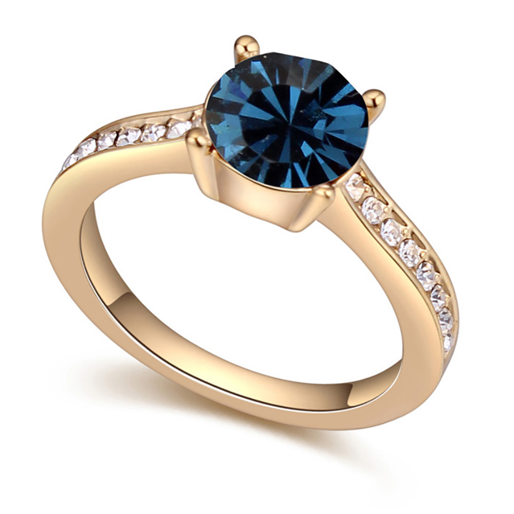 Delicado anillo en baño de oro amarillo de 18 quilates, fino diseño, con cristal azul corte brillante e incrustaciones de cristales en color blanco.