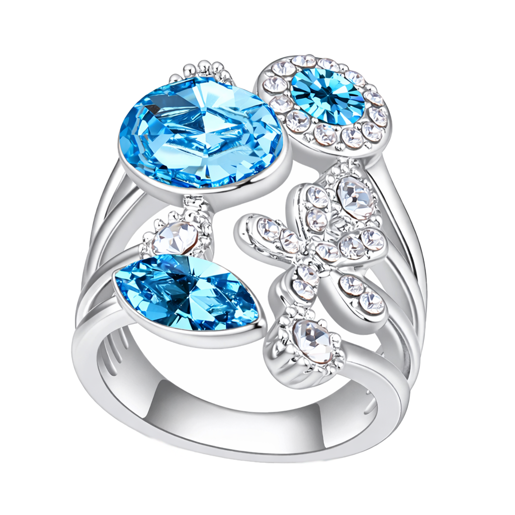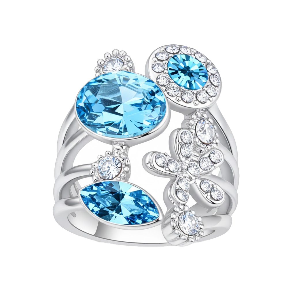 Anillo en baño de oro blanco de 18 quilates, fino diseño estilo aro múltiple, con flor plateada, cristales azules corte brillante y corte marquesa e incrustaciones de cristales blancos.