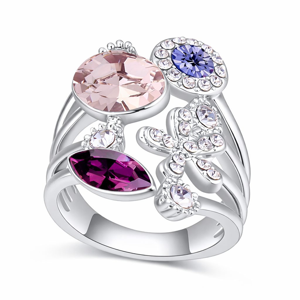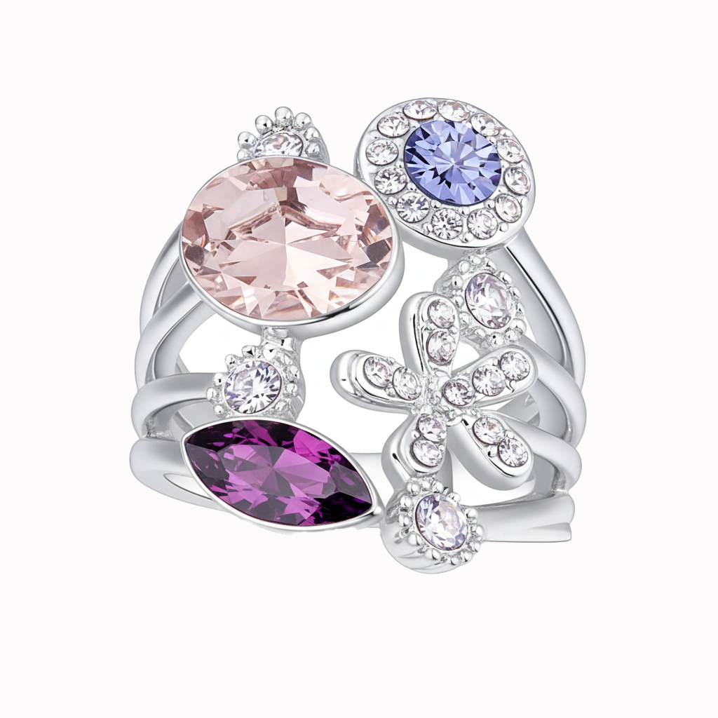 Anillo en baño de oro blanco de 18 quilates, fino diseño, estilo multiaro, con flor plateada, cristal rosa corte redondo, cristal morado corte brillante, cristal violeta corte marquesa e incrustaciones de cristales blancos.