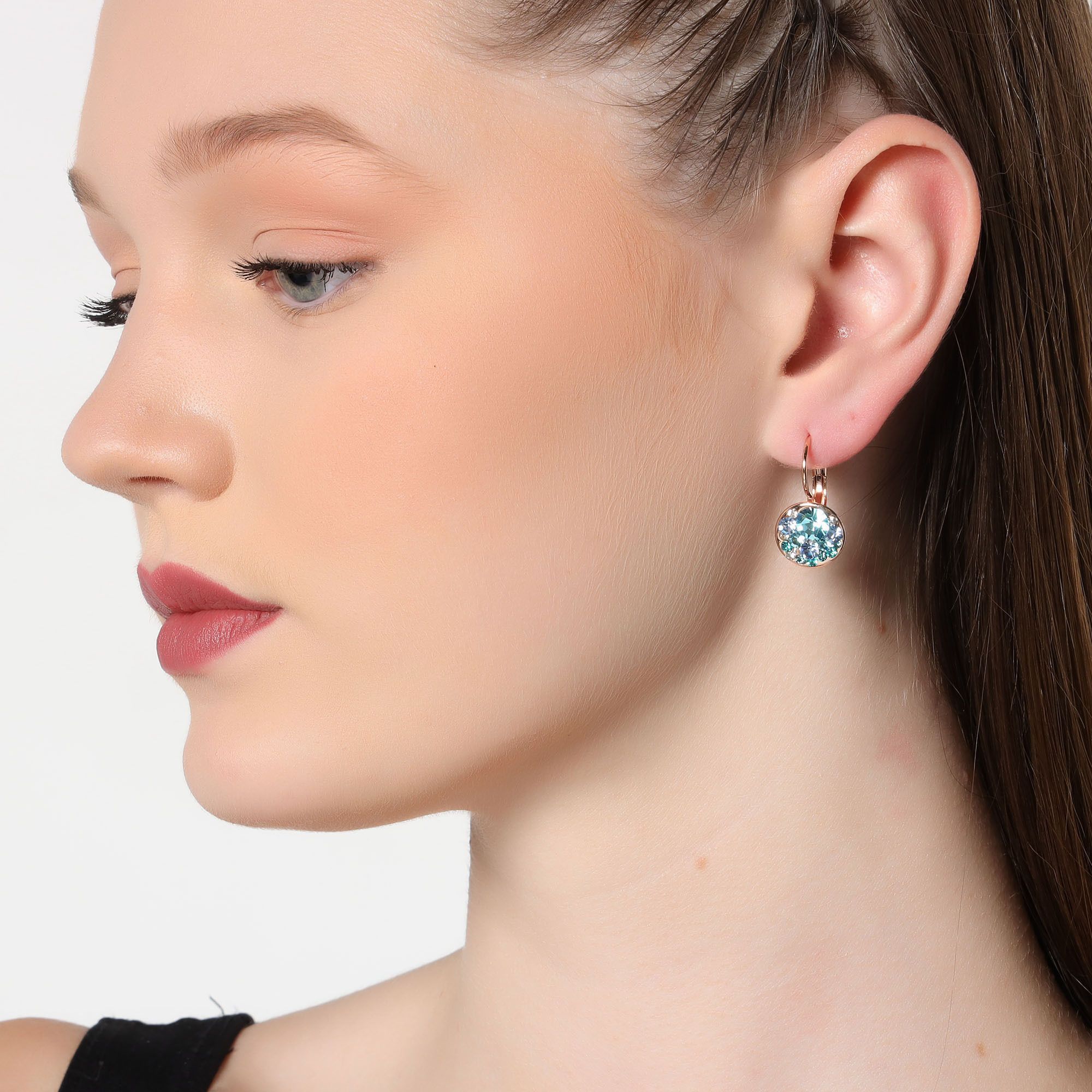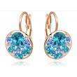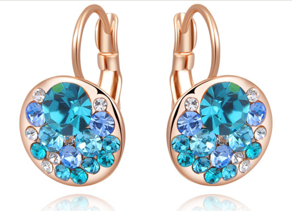 Lindos aretes en baño de oro rosa de 18 quilates, diseño de círculo, con incrustaciones de cristales en tonos azules y blanco.