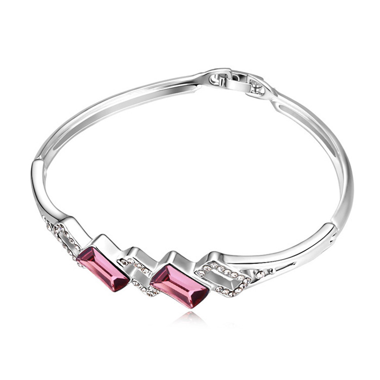 Brazalete en baño de oro blanco de 18 quilates, diseño de rectángulos, con cristales lila corte baguette e incrustaciones de cristales blancos.