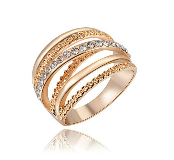 Fino anillo en baño de oro amarillo de 18 quilates, diseño de grecas en relieve, estilo multiaro, con incrustaciones de cristales en color blanco.