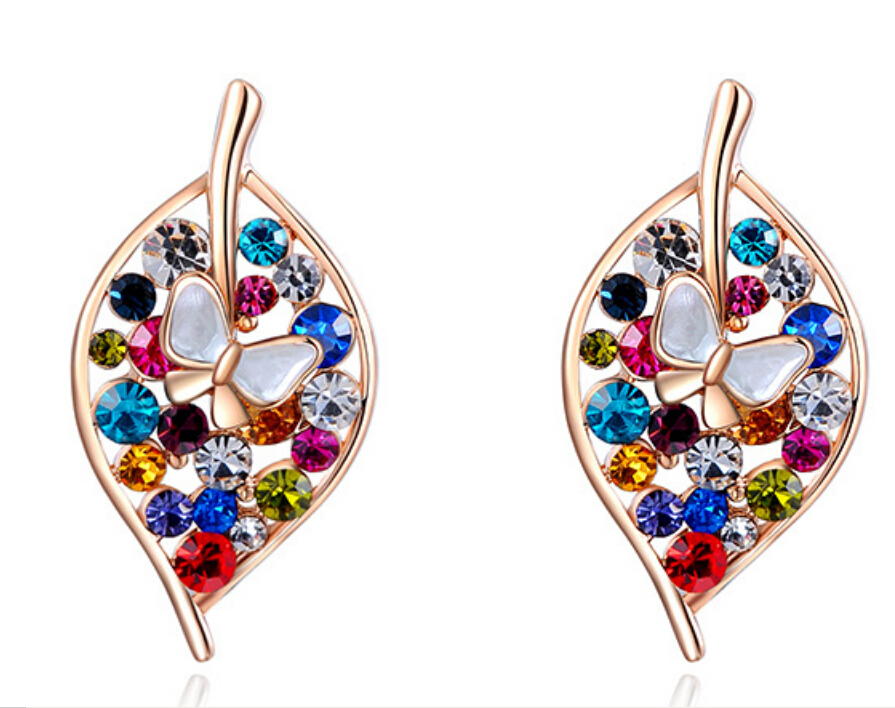 Lindos aretes en baño de oro rosa de 18 quilates, diseño de hoja, con mariposa en relieve e incrustaciones de cristales multicolor.