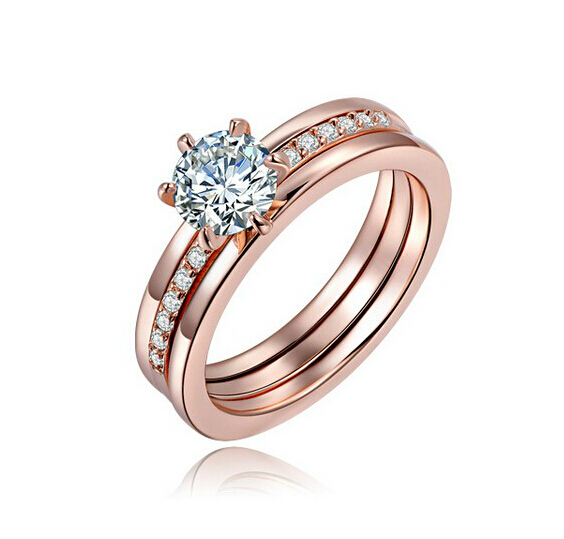 Hermoso anillo en baño de oro rosa de 18 quilates, diseño de tres anillos, con cristal blanco corte brillante e incrustaciones de cristales blancos.