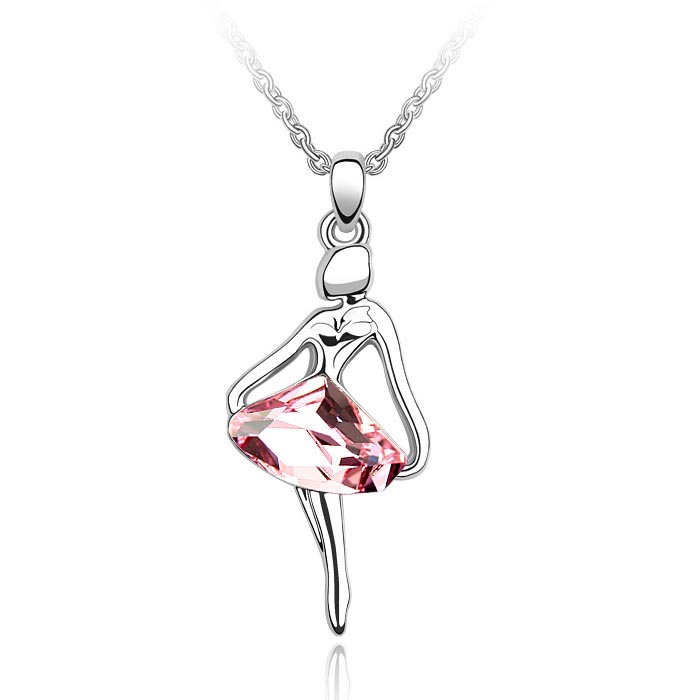 Hermoso Dije en baño de oro blanco de 18 quilates, diseño de bailarina de ballet con incrustación de cristal en color rosa. Cuenta con una cadena de 40 cm, con extención de 5 cm. Fabricado en una estructura de aleación de platino con rodio sin níquel 1. joyería Hipoalergénica. 2. Incluye cajita de joyería. 3. Garantía de 30 días por defectos de fabrica.