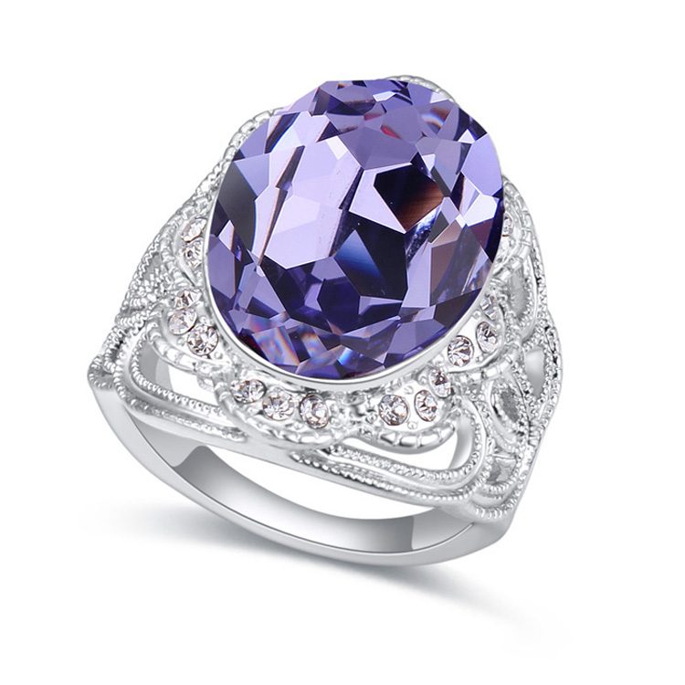 Anillo en baño de oro blanco de 18 quilates, fino diseño, estilo filigrana, con cristal morado corte oval e incrustaciones de cristales blancos.
