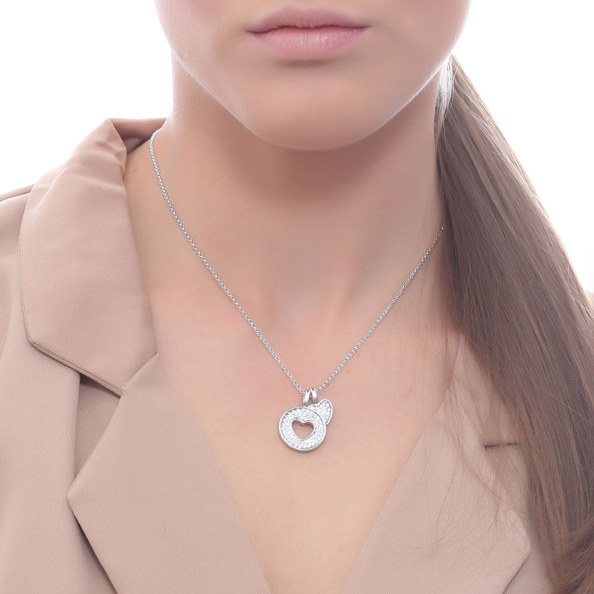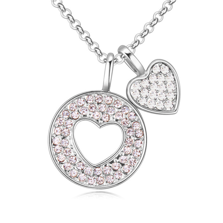 Dije con cadena en baño de oro blanco de 18 quilates, diseño de círculo con corazónes con incrustación de Fabricado en una estructura de aleación de platino con rodio sin níquel 1. joyería Hipoalergénica. 2. Incluye cajita de joyería. 3. Garantía de 30 días por defectos de fabrica.