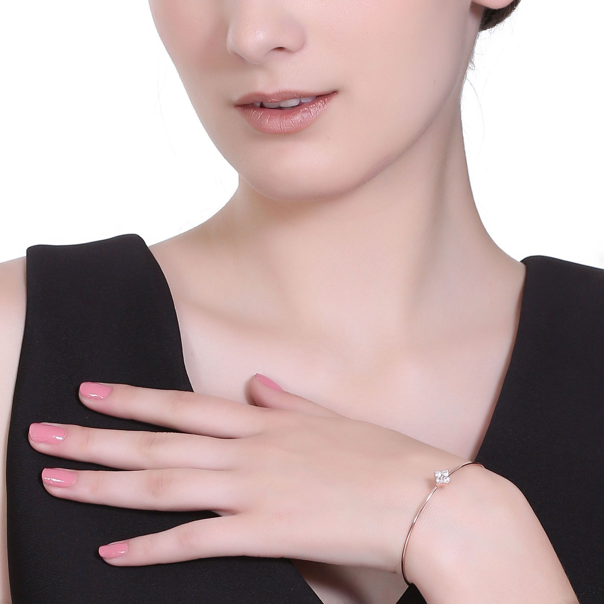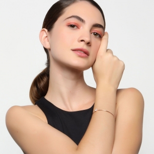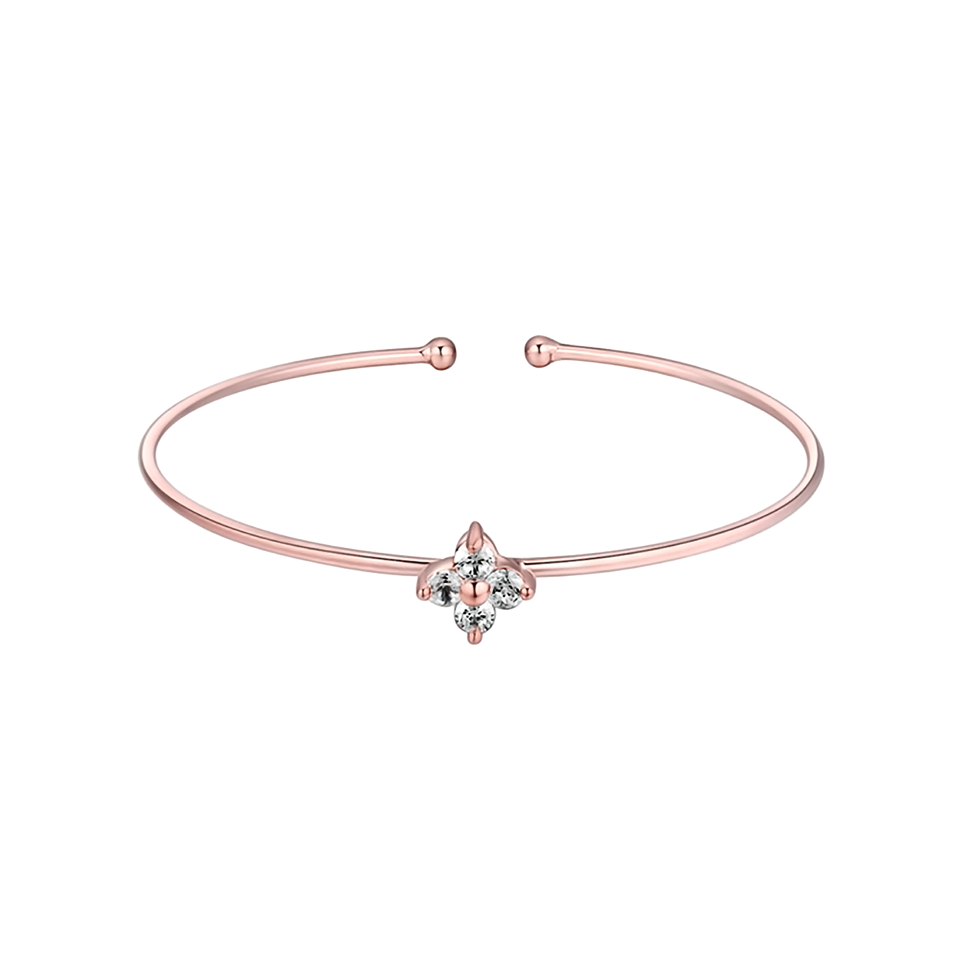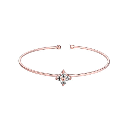 Fina pulsera en baño de oro rosa de 18 quilates, diseño de flor, con incrustaciones de cristales en color blanco corte brillante.