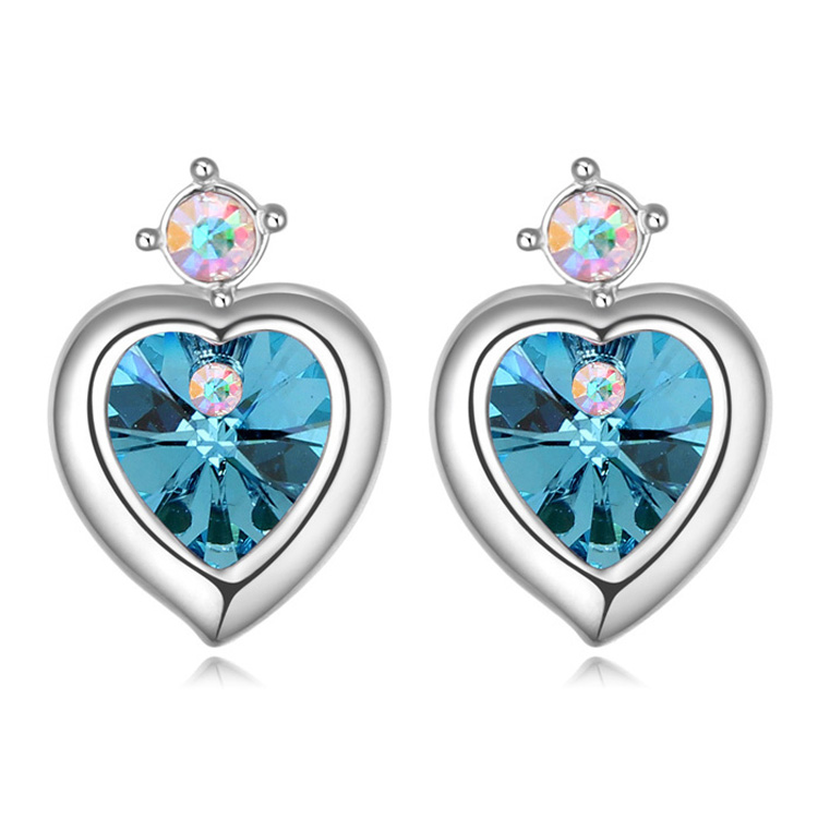 Preciosos aretes en baño de oro blanco de 18 quilates, diseño de corazón, con cristal azul corte corazón e incrustaciones de cristales tornasol.