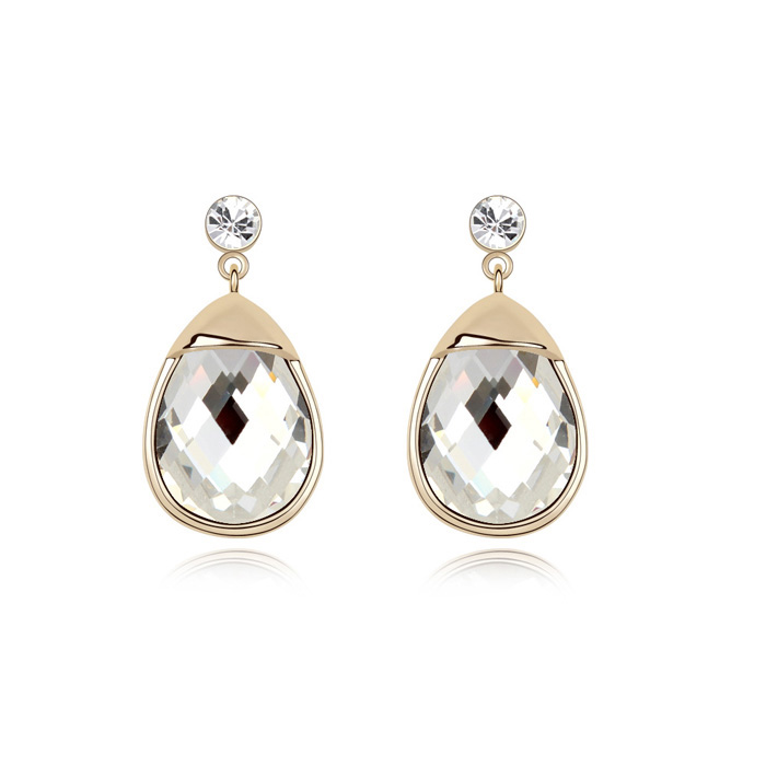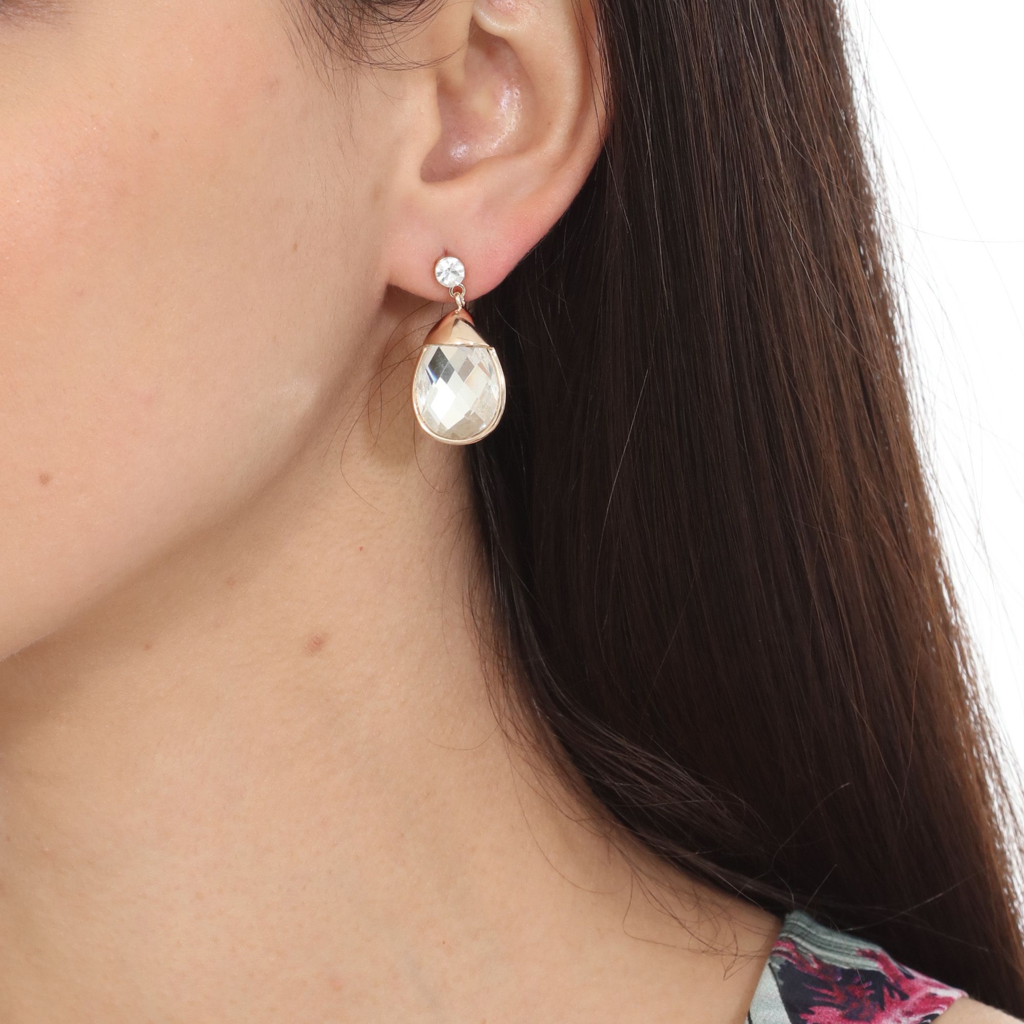 Elegantes aretes en baño de oro amarillo de 18 quilates, elegante diseño de gota, con cristal blanco facetado e incrutación de cristal color blanco.