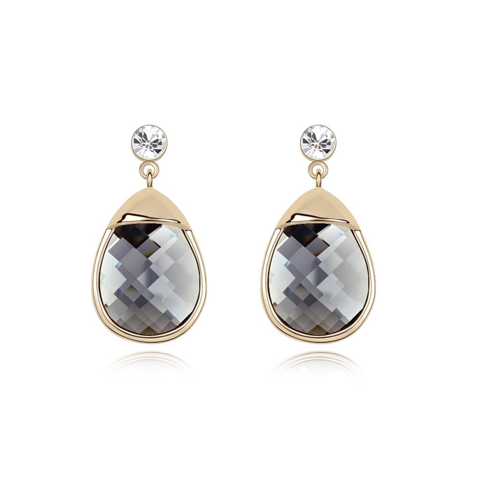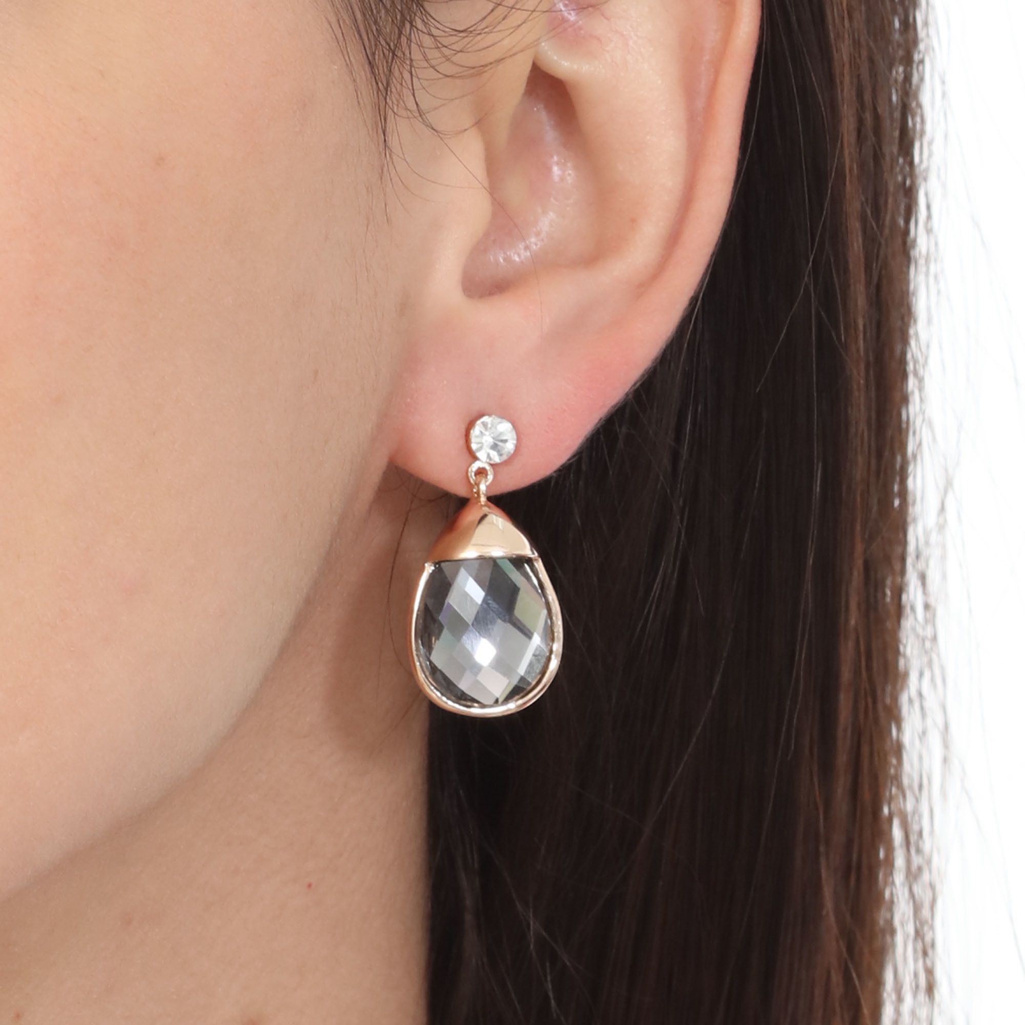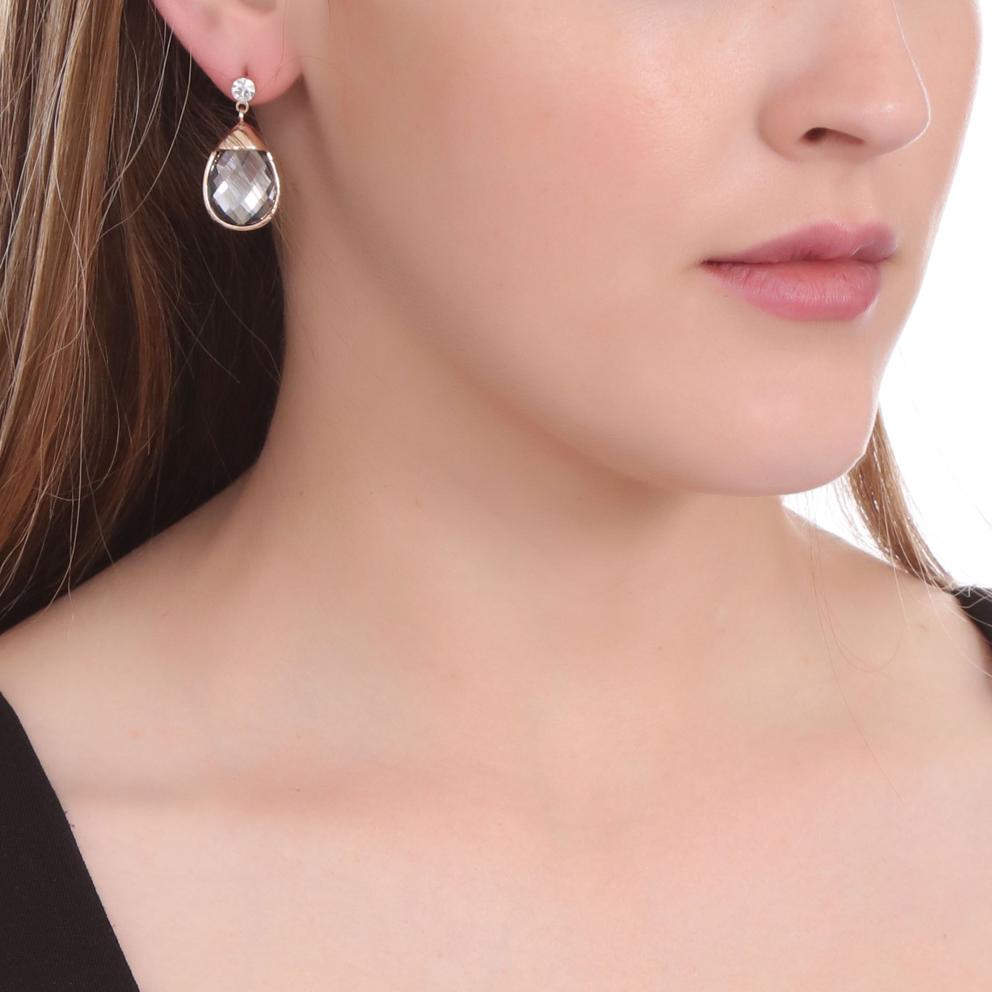 Elegantes aretes en baño de oro amarillo de 18 quilates, elegante diseño de gota, con cristal humo facetado e incrustación de cristal blanco.