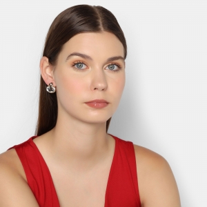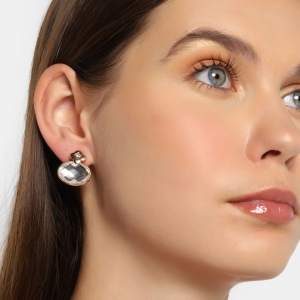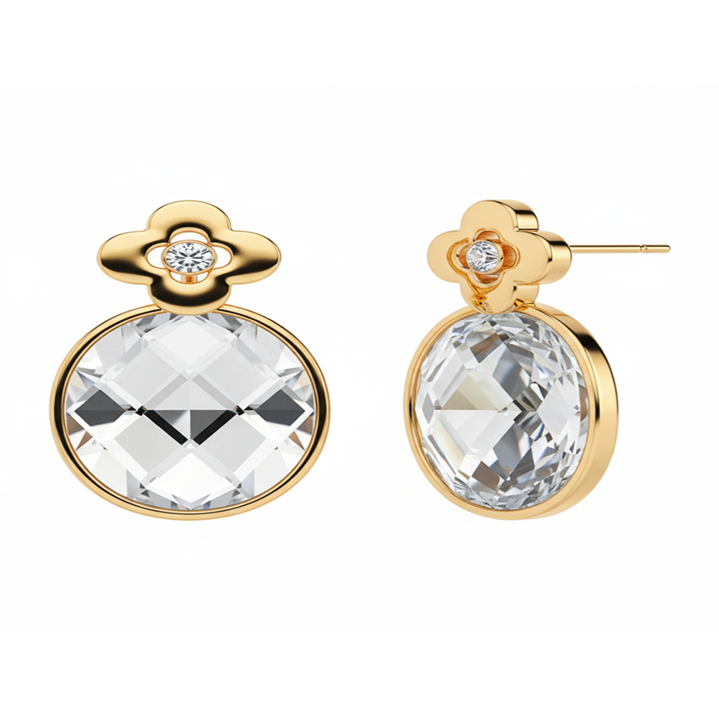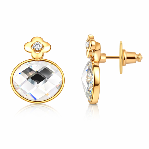 Aretes en baño de oro amarillo de 18 quilates, elegante diseño de óvalo, con flor en relieve, cristal blanco corte oval facetado e incrustación de cristal blanco.