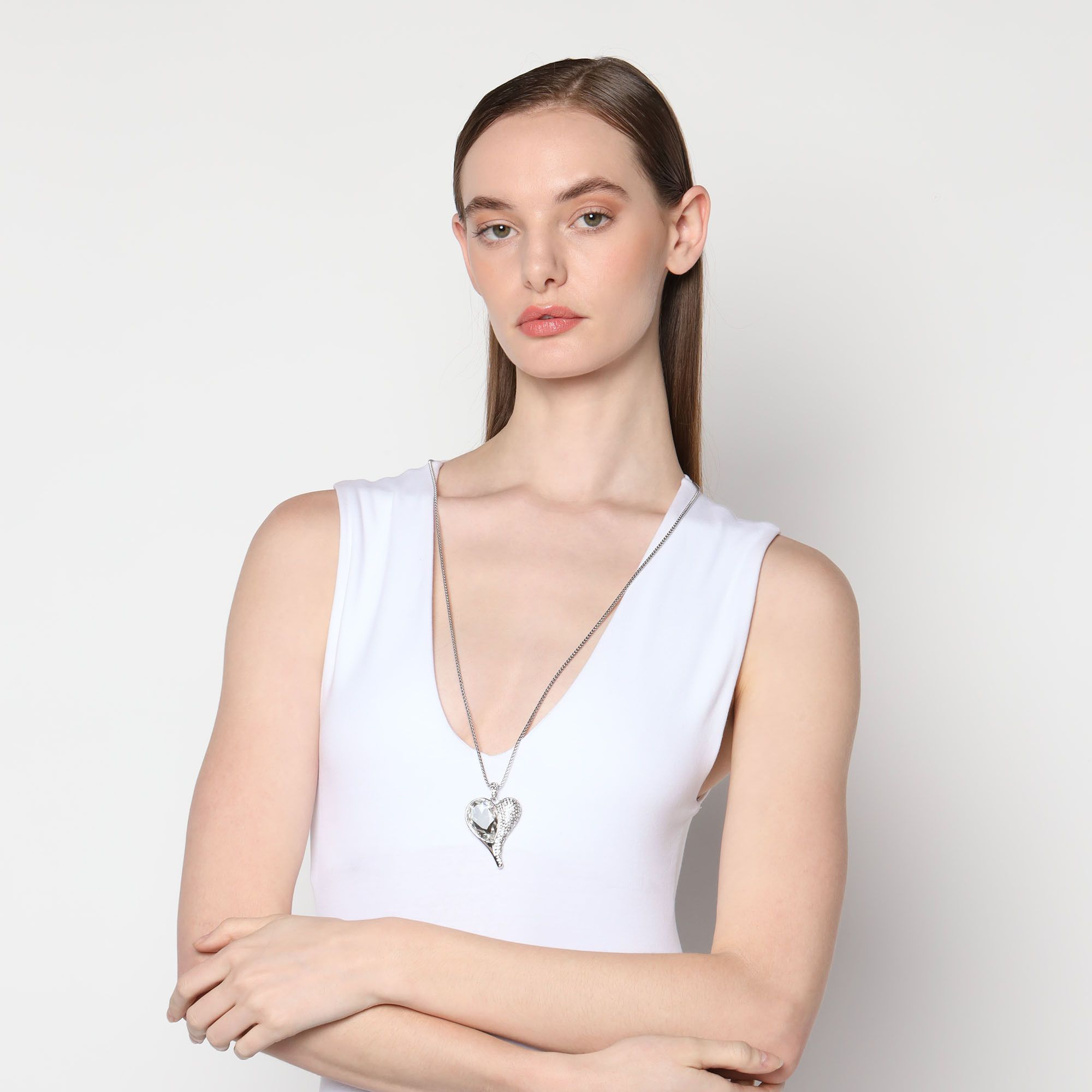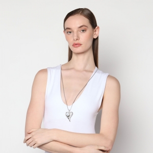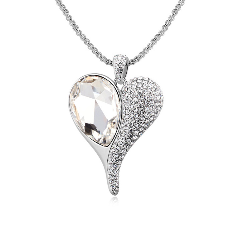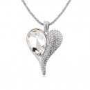 Hermoso collar, en baño de oro blanco de 18 quilates, con exquisito diseño de corazón, cristal blanco corte pera e incrustaciones de cristales blancos.