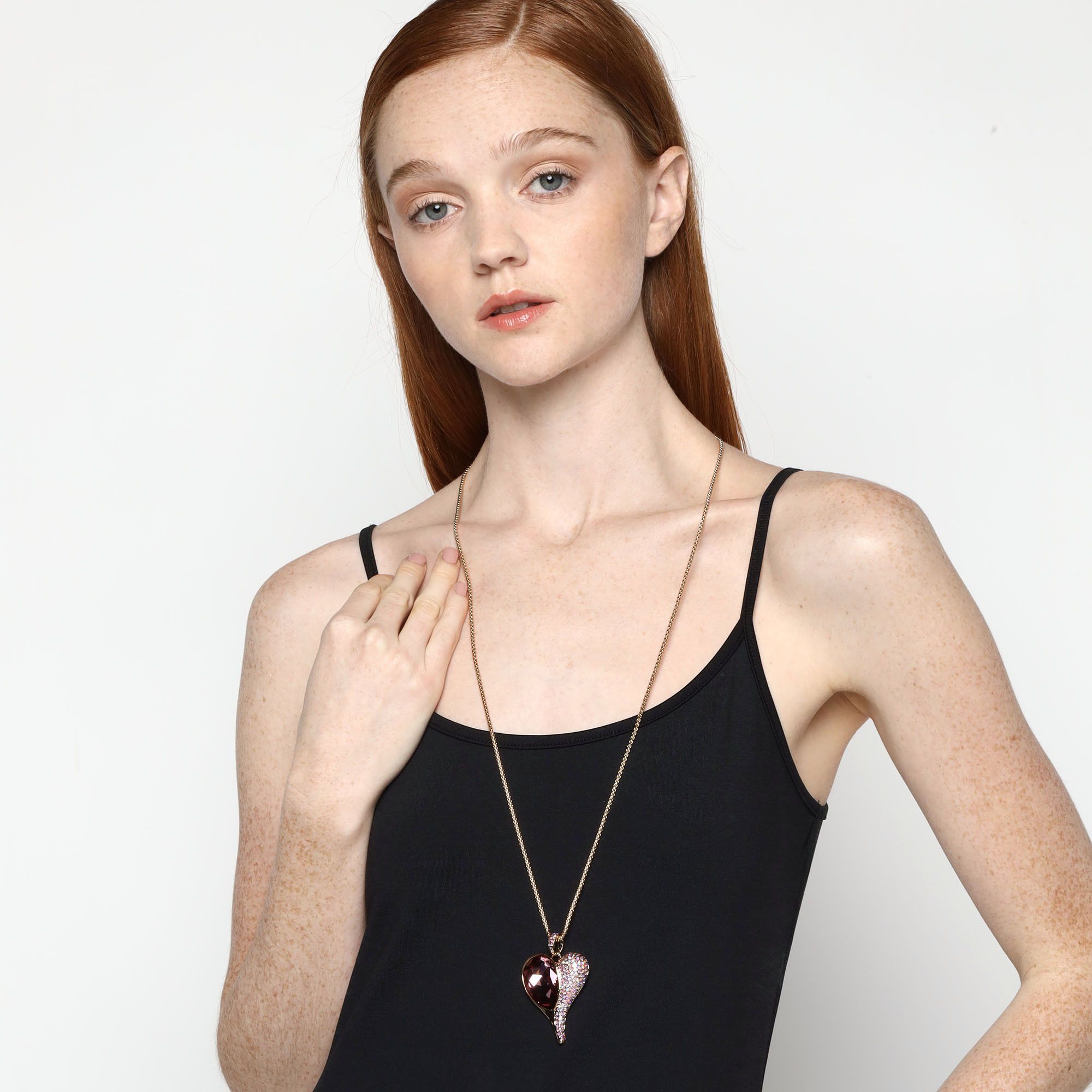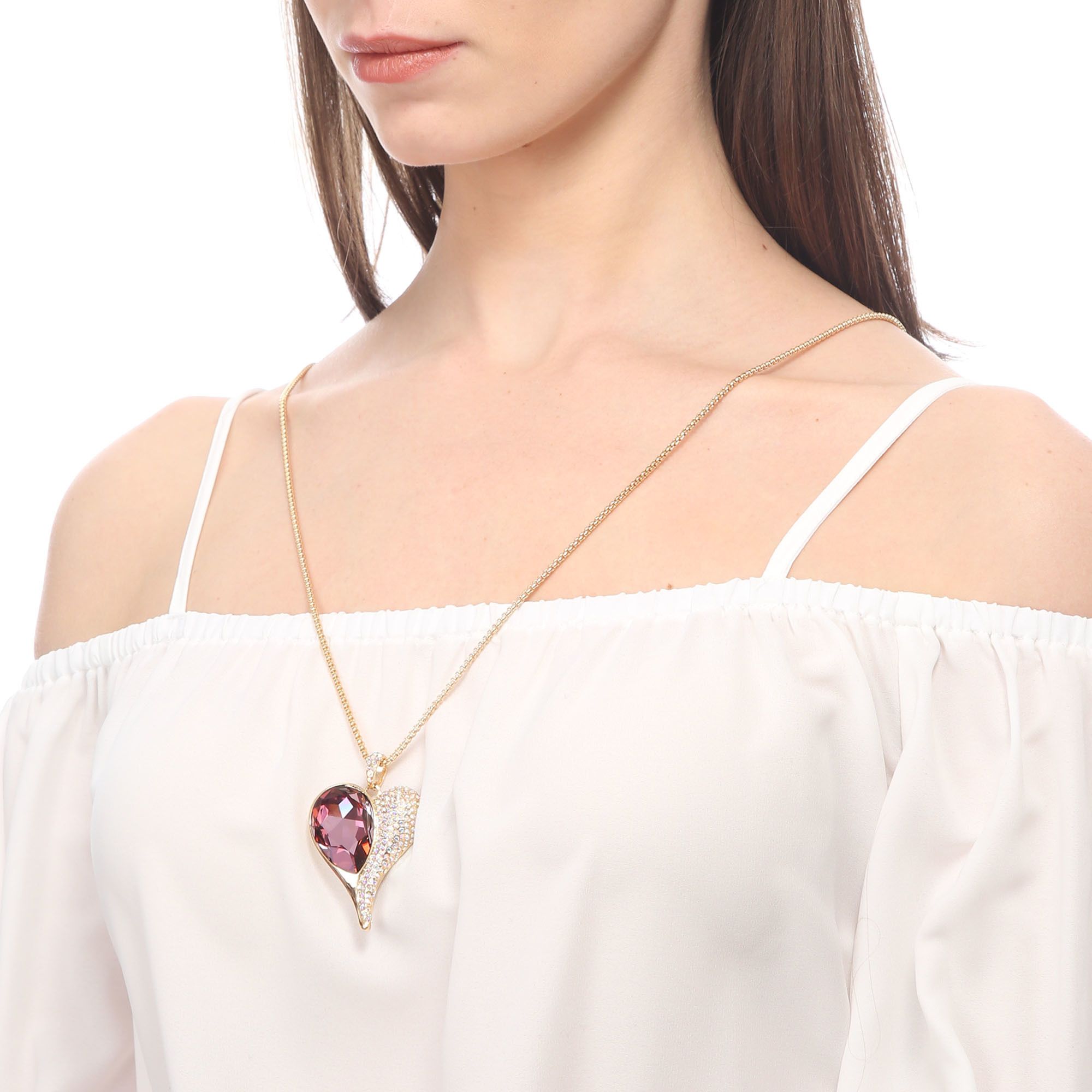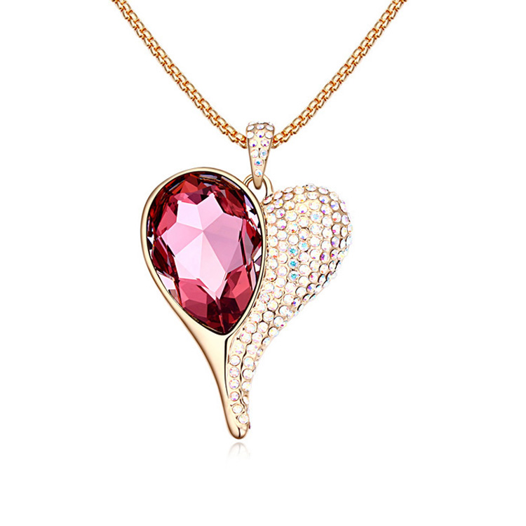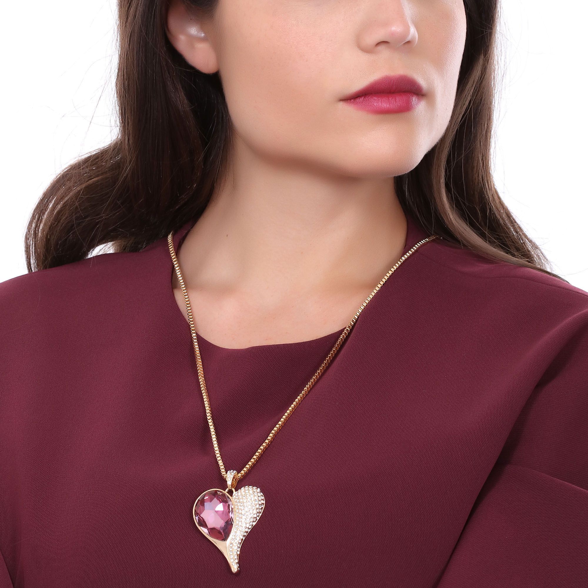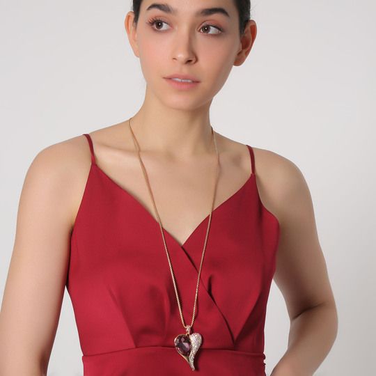 Hermoso Collar en baño de oro amarillo de 18 quilates, diseño en forma de corazón con incrustación de cristales en color rosa.