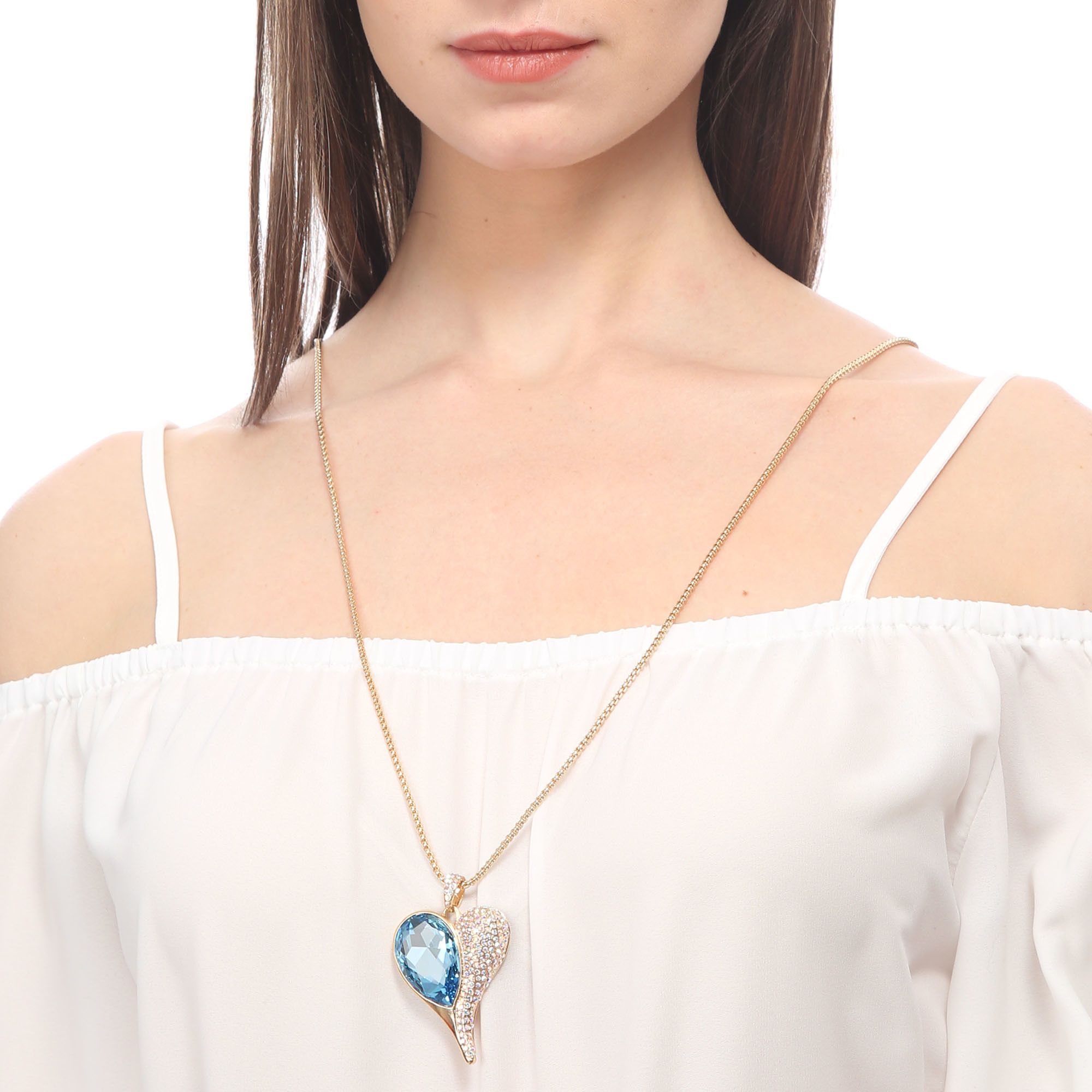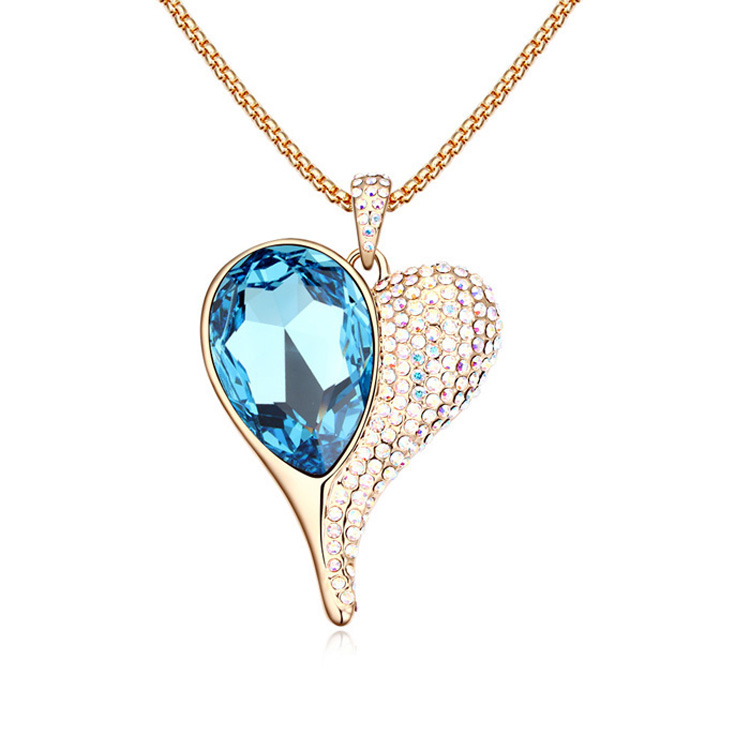 Collar en baño de oro amarillo de 18 quilates, diseño de corazón cristal azul corte pera e incrustaciones de cristales tornasol.