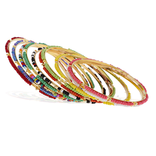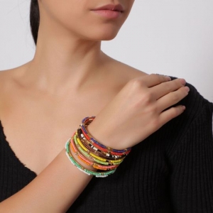 Brazalete múltiple aro, en baño de oro amarillo de 18 quilates, original diseño, en coloridos tonos de chaquiras: azul, amarillo, blanco, negro, café, naranja, rojo, rosa, verde aqua y verde limón.