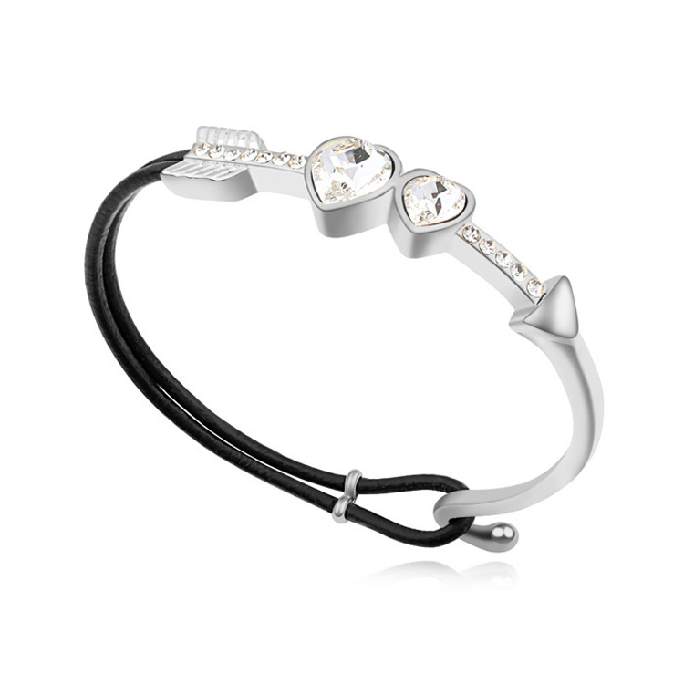 Brazalete en baño de oro blanco de 18 quilates y correa color negro, diseño de flecha, con corazones en cristal blanco e incrustaciones de cristales blancos.