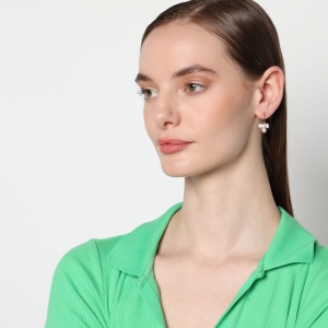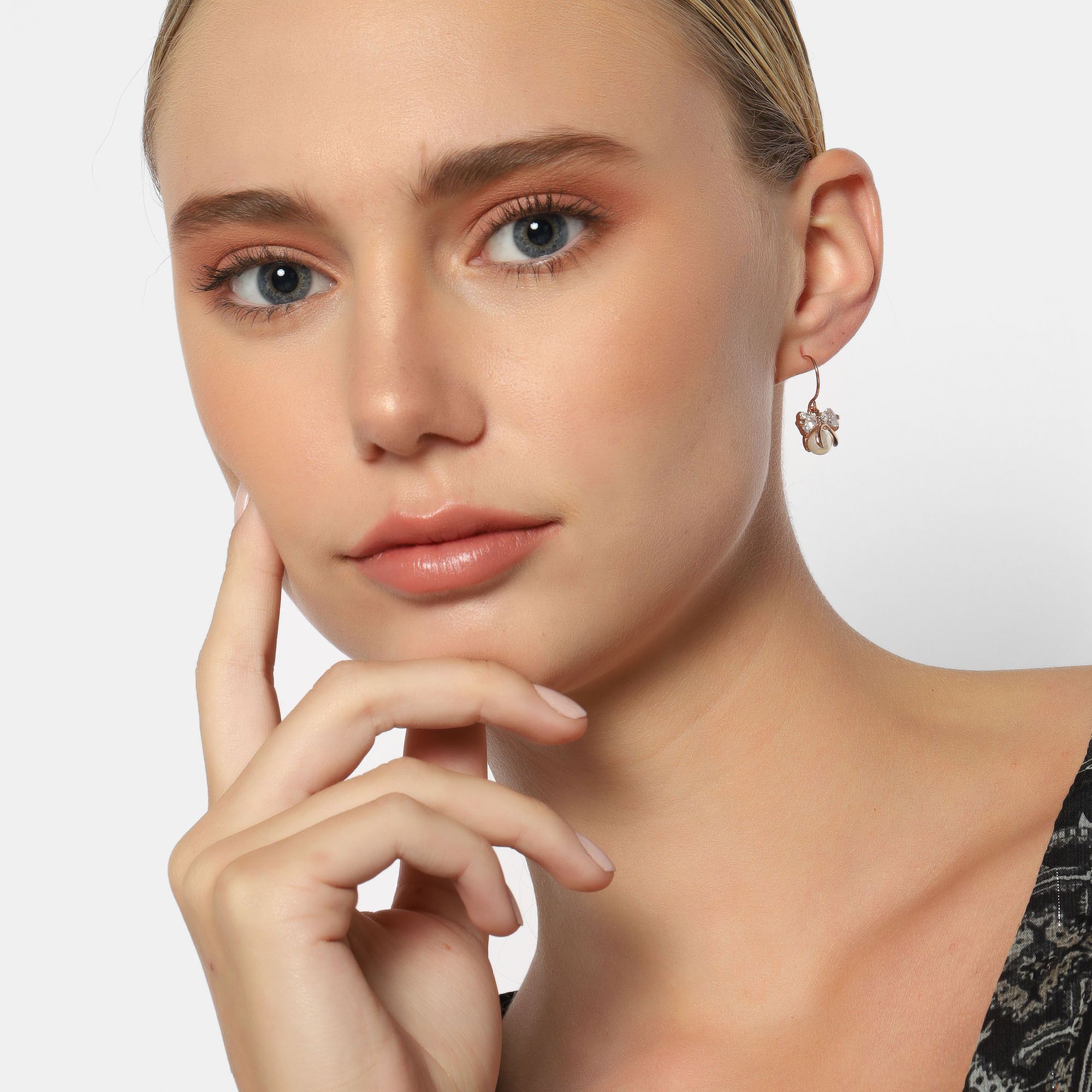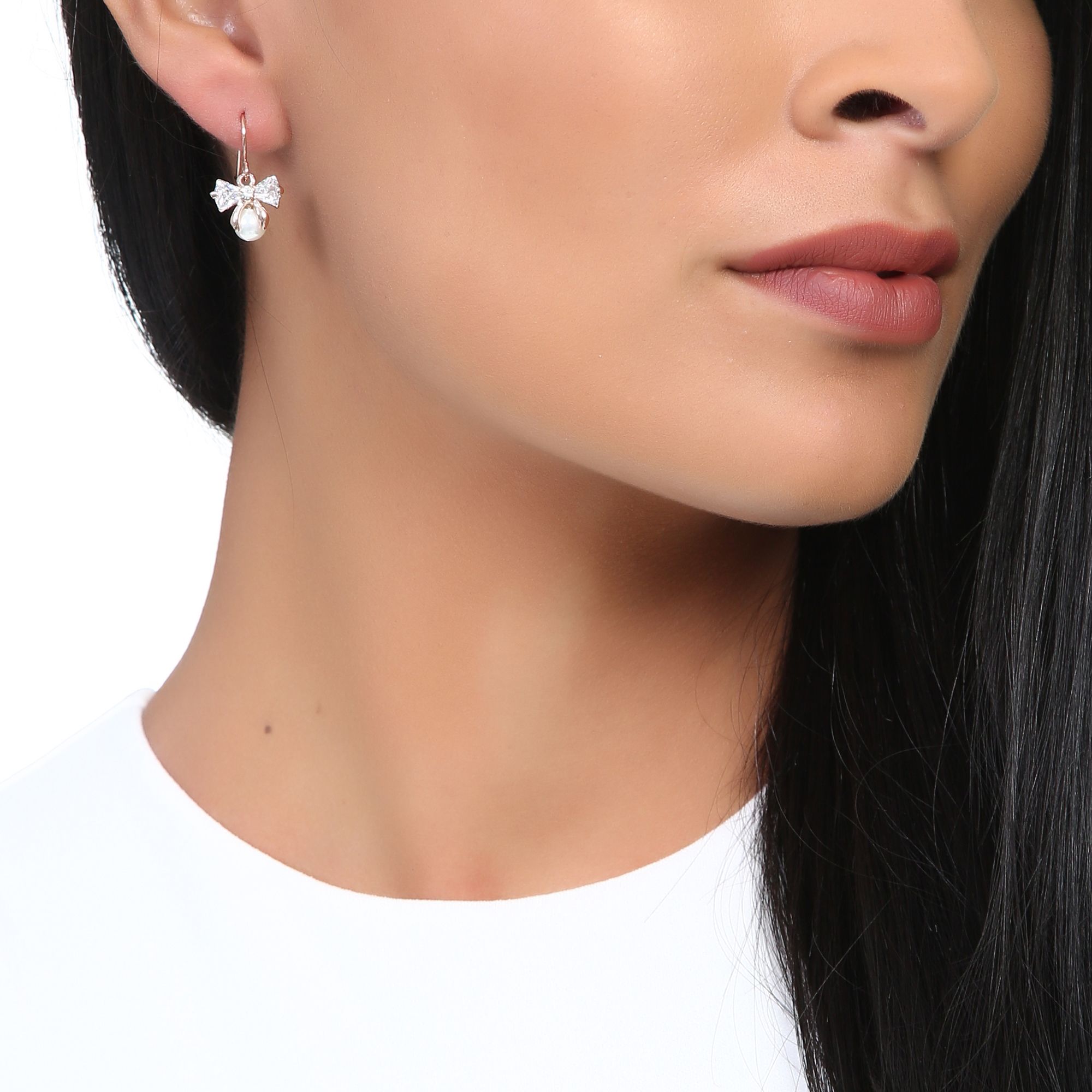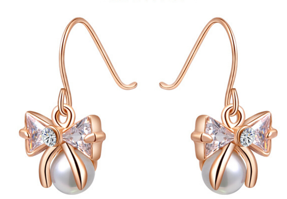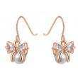 Preciosos aretes en baño de oro rosa de 18 quilates, diseño de moño, con detalle de perla blanca e incrustación de cristales en color blanco.