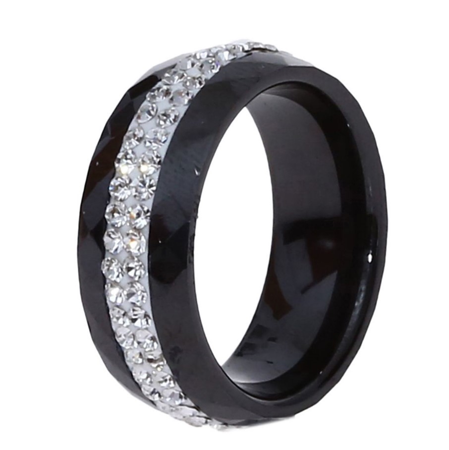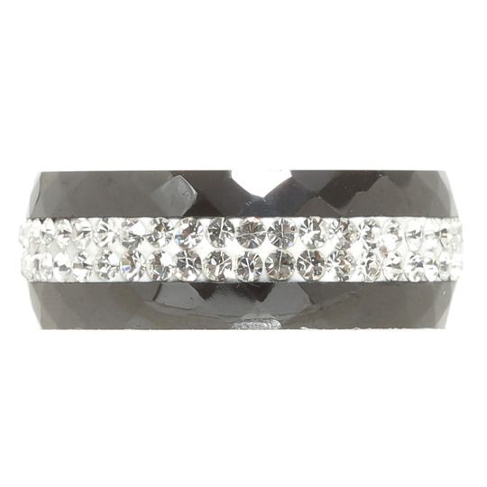 Hermoso anillo de cerámica color negro facetado, diseño ranurado, estilo convexo, con incrustaciones de cristales en color blanco.