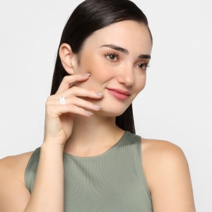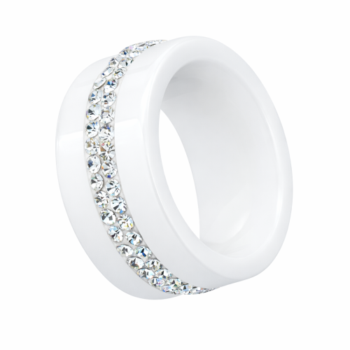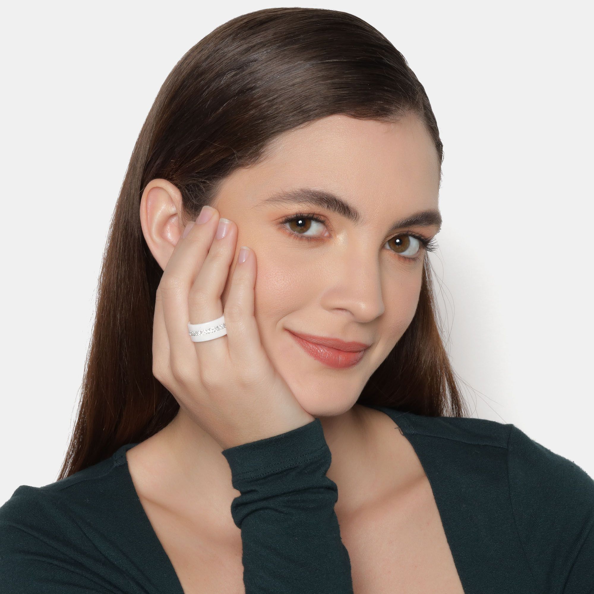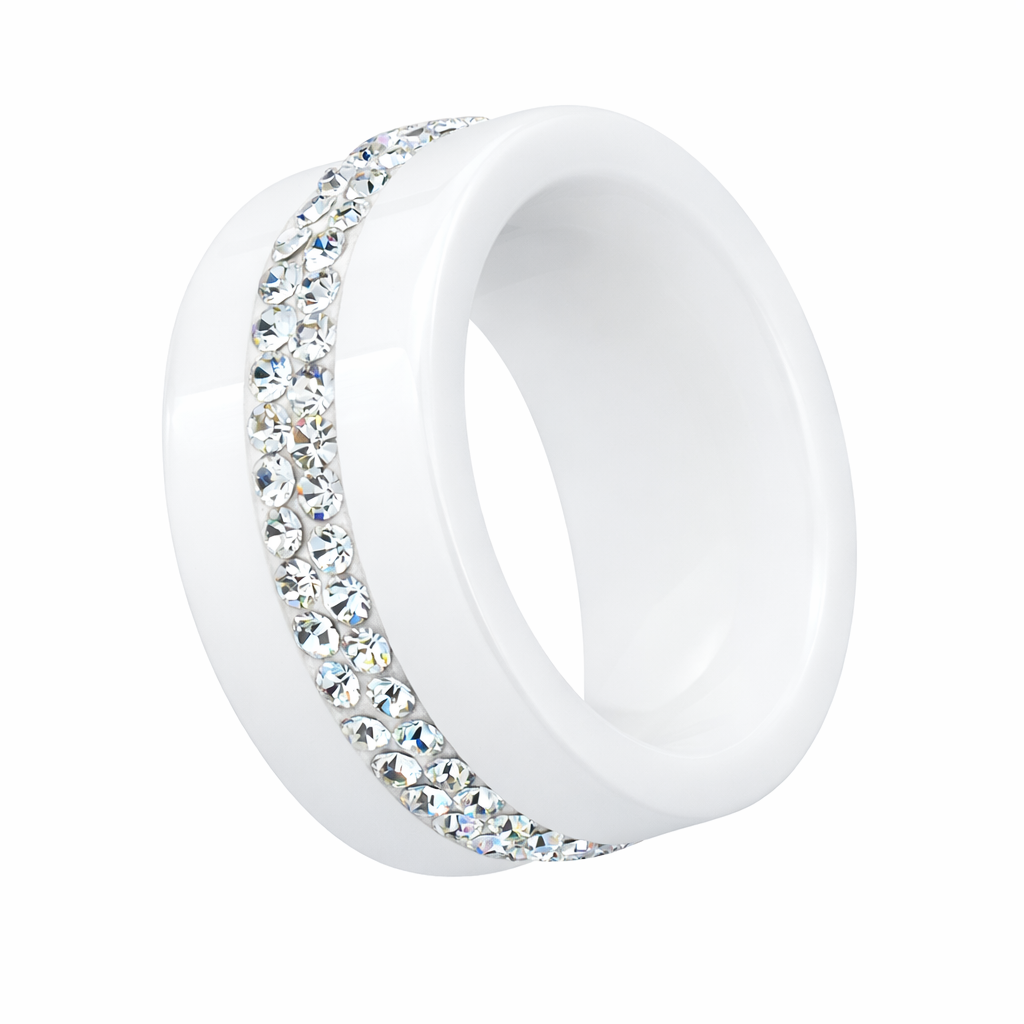 Hermoso anillo de cerámica en color blanco, diseño ranurado, estilo cóncavo, con incrustaciones de cristales blancos.