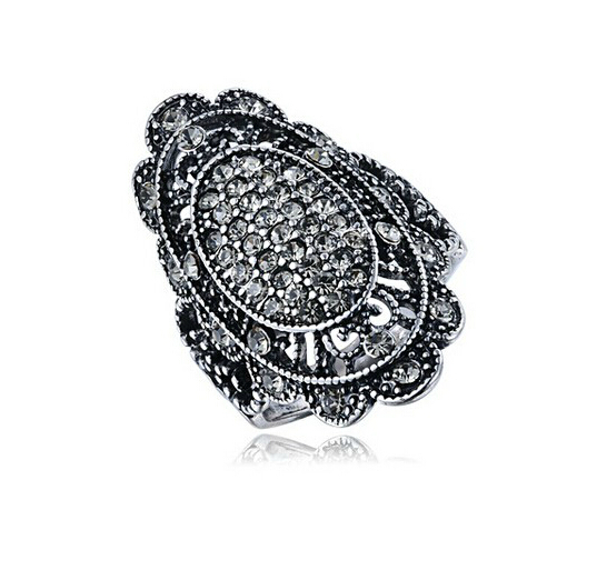 Fino anillo en baño de oro blanco de 18 quilates, diseño ovalado, estilo antiguo con incrustaciones de cristales en color blanco.