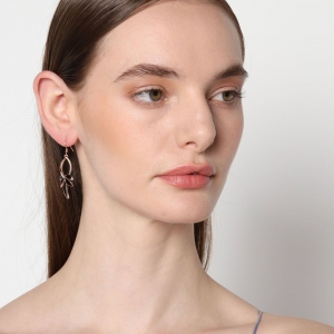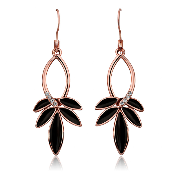 Elegantes aretes en baño de oro rosa de 18 quilates, diseño de hojas, esmaltado color negro e incrustación de cristales blancos.
