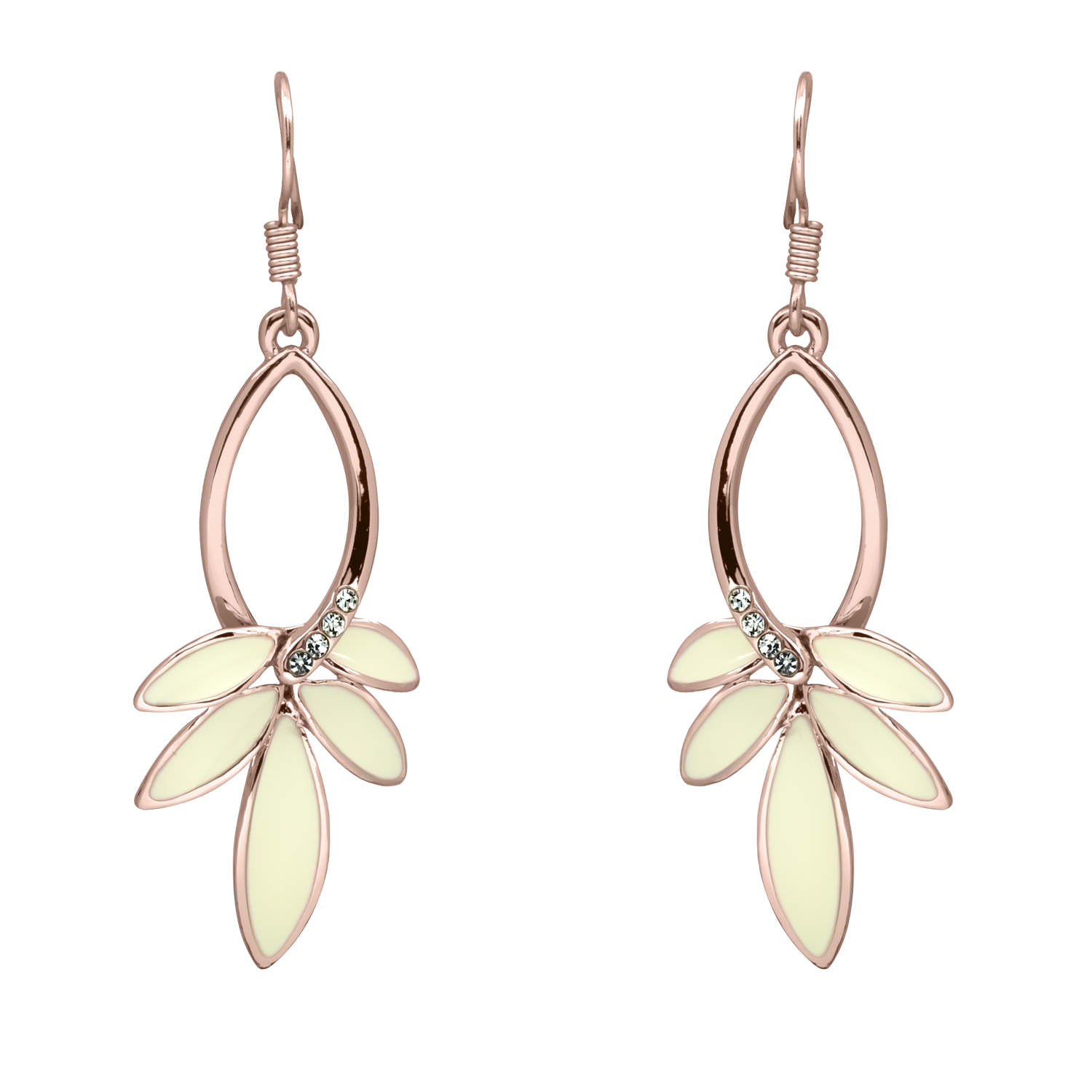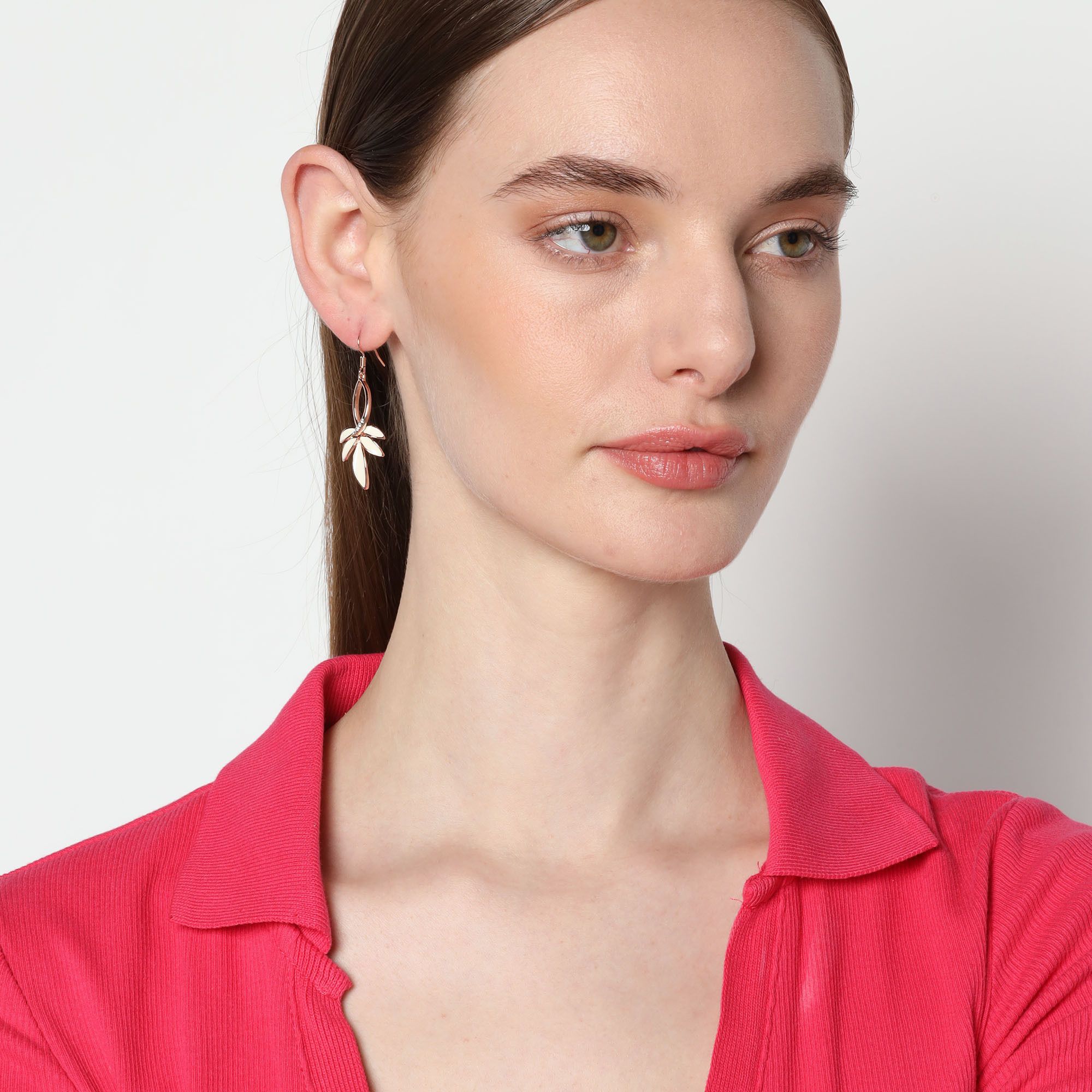 Elegantes aretes en baño de oro rosa de 18 quilates, diseño de hojas con esmaltado blanco e incrustación de cristales en color blanco.