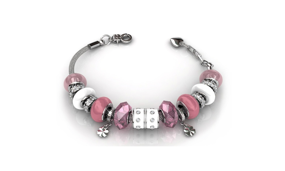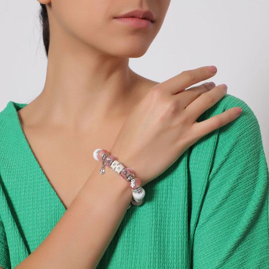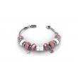 Hermoso brazalete de acero inoxidable, original diseño, con cuentas de cristal facetado color rosa y blanco, lisas rosa baby, aros plateados, mini dijes de flores e incrustaciones de cristales blancos.