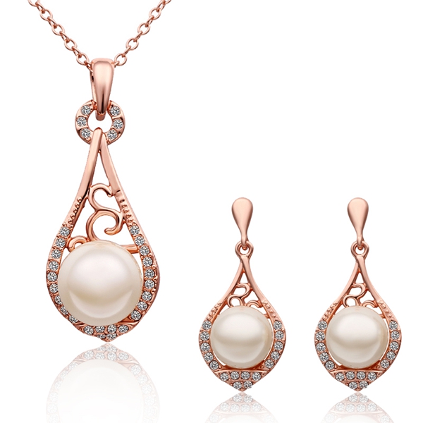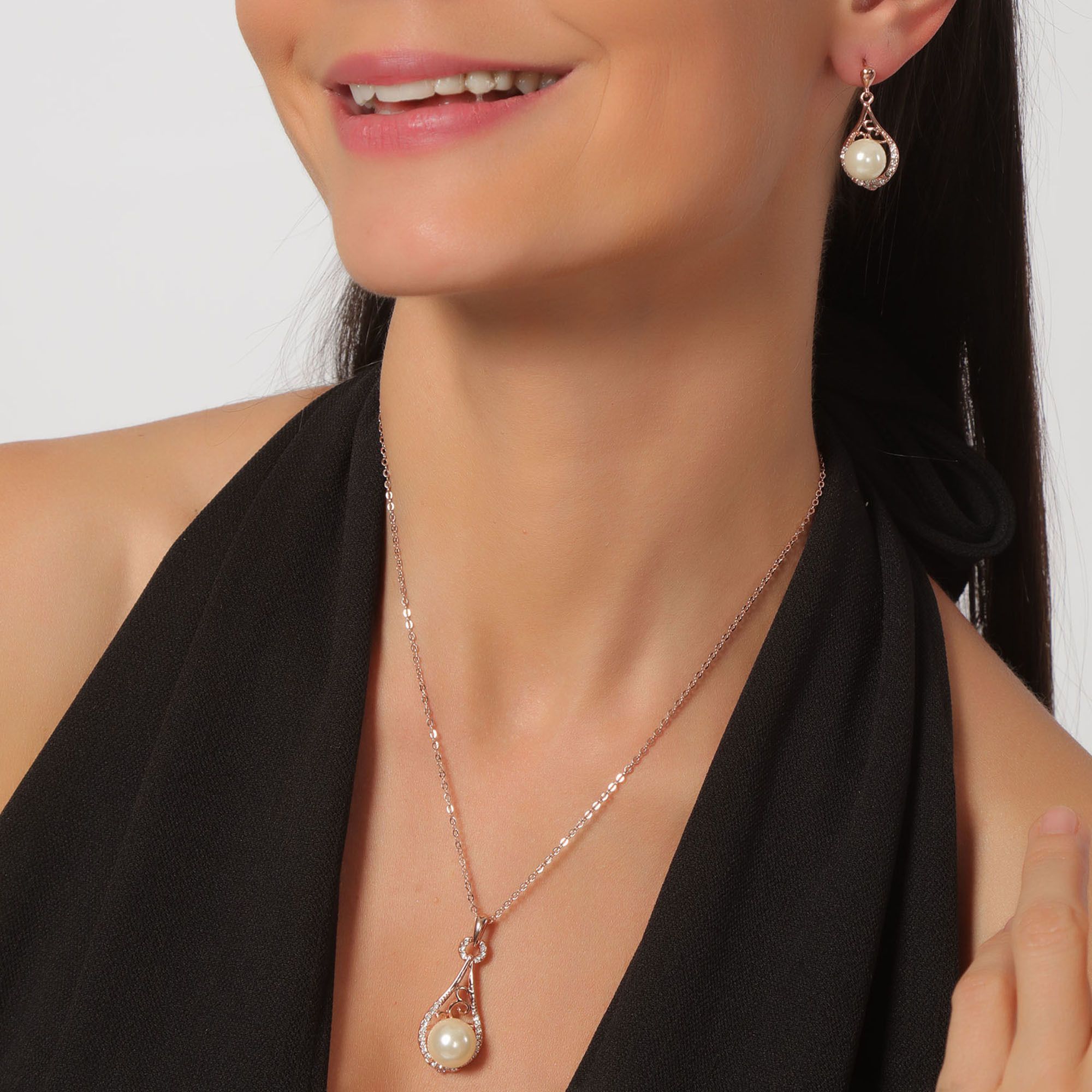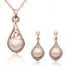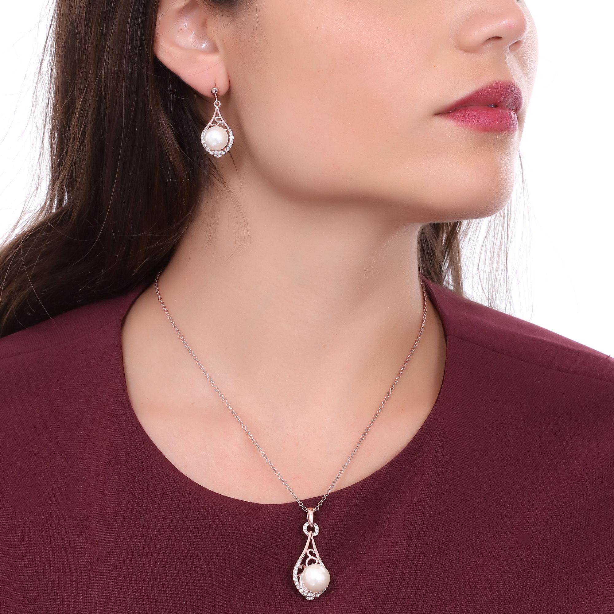 Juego de aretes y dije en baño de oro rosa de 18 quilates, diseño de gota con detalle de perla, incrustación de cristales en color blanco.