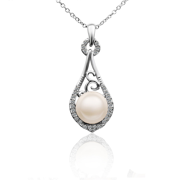 Dije con cadena en baño de oro blanco de 18 quilates, Elegante diseño de gota con detalle de perla blanca incrustación de cristales en color blanco. Fabricado en una estructura de aleación de platino con rodio sin níquel 1. joyería Hipoalergénica. 2. Incluye cajita de joyería. 3. Garantía de 30 días por defectos de fabrica.