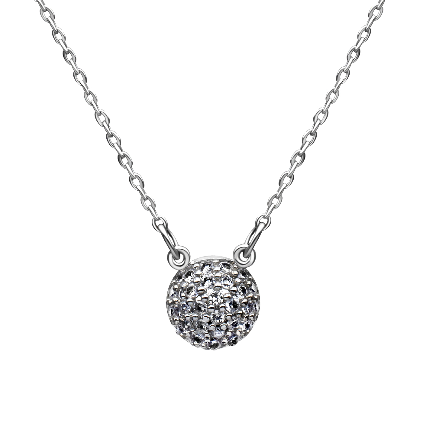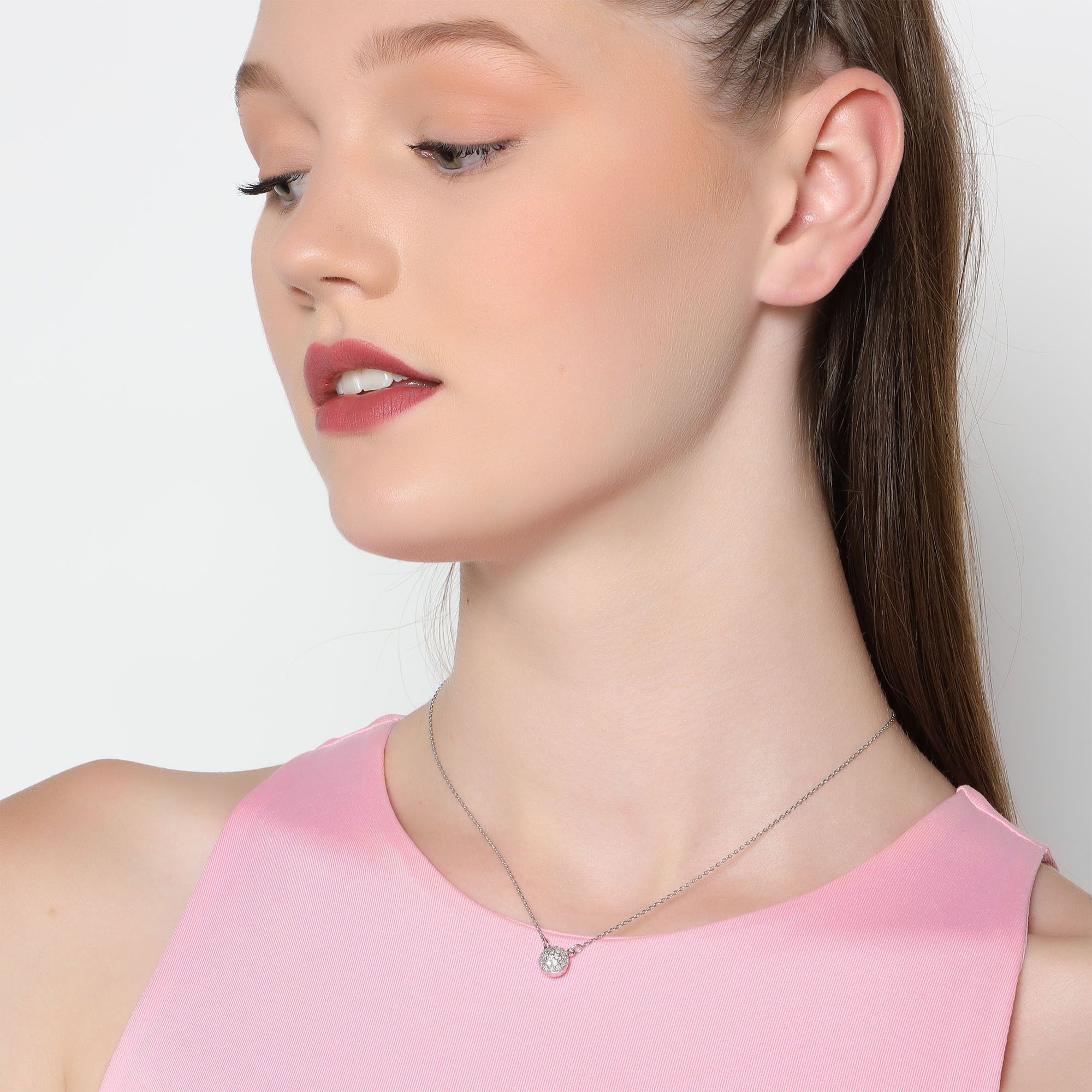 Lindo Dije en baño de oro blanco de 18 quilates, diseño de círculo con incrustación de cristales en color blanco.