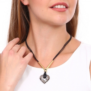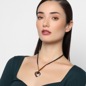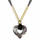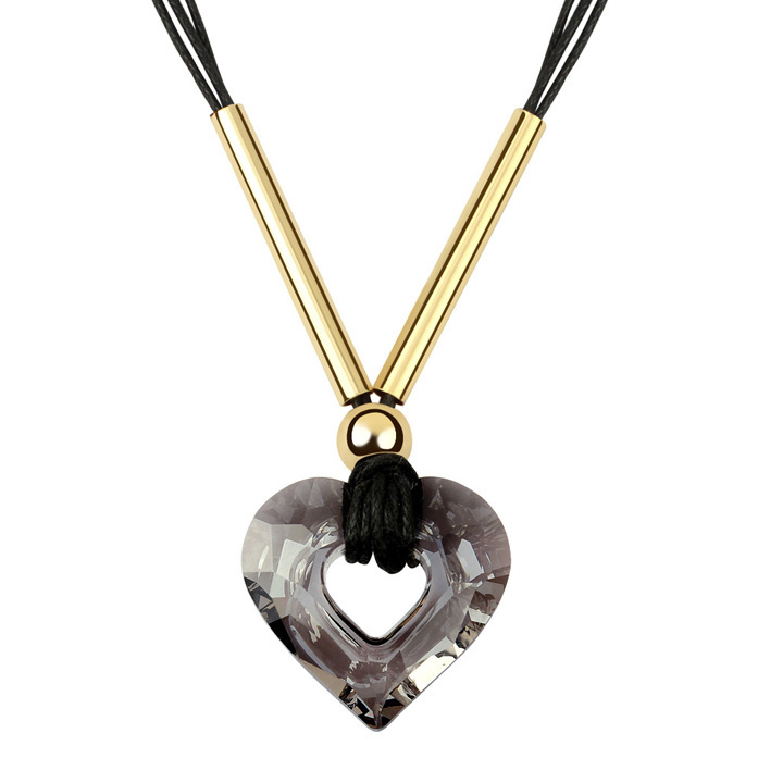 Hermoso collar con detalles en baño de oro amarillo de 18 quilates, corazón de cristal color humo y correas de hilo reforzado color negro.