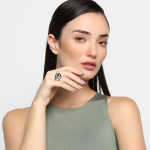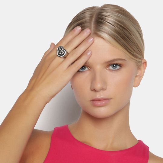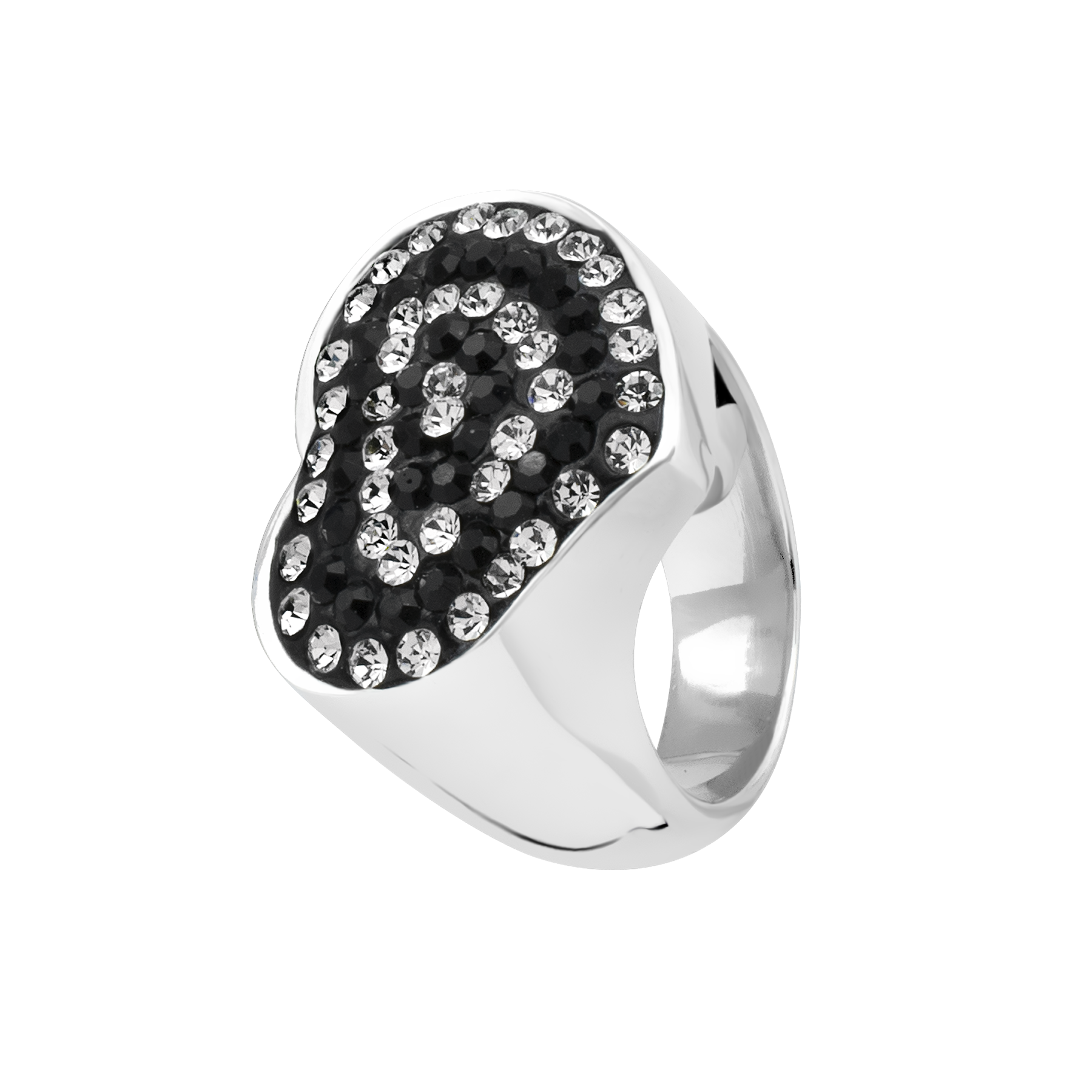 Anillo en acero inoxidable, diseño de corazón con incrustaciones de cristales en color blanco y negro.