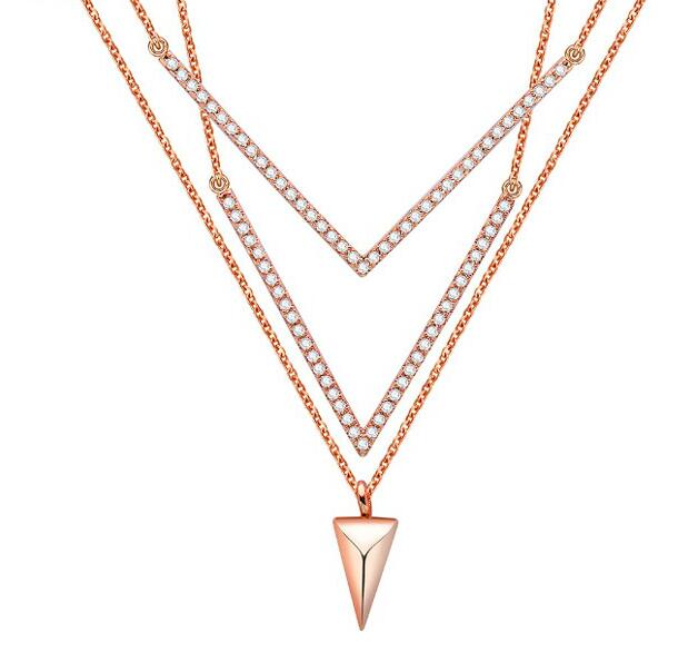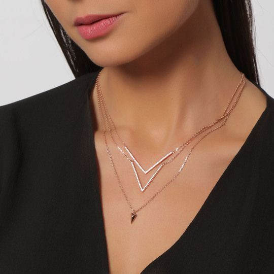 Hermoso collar en baño de oro rosa de 18 quilates, diseño de "V" con cristales blancos.