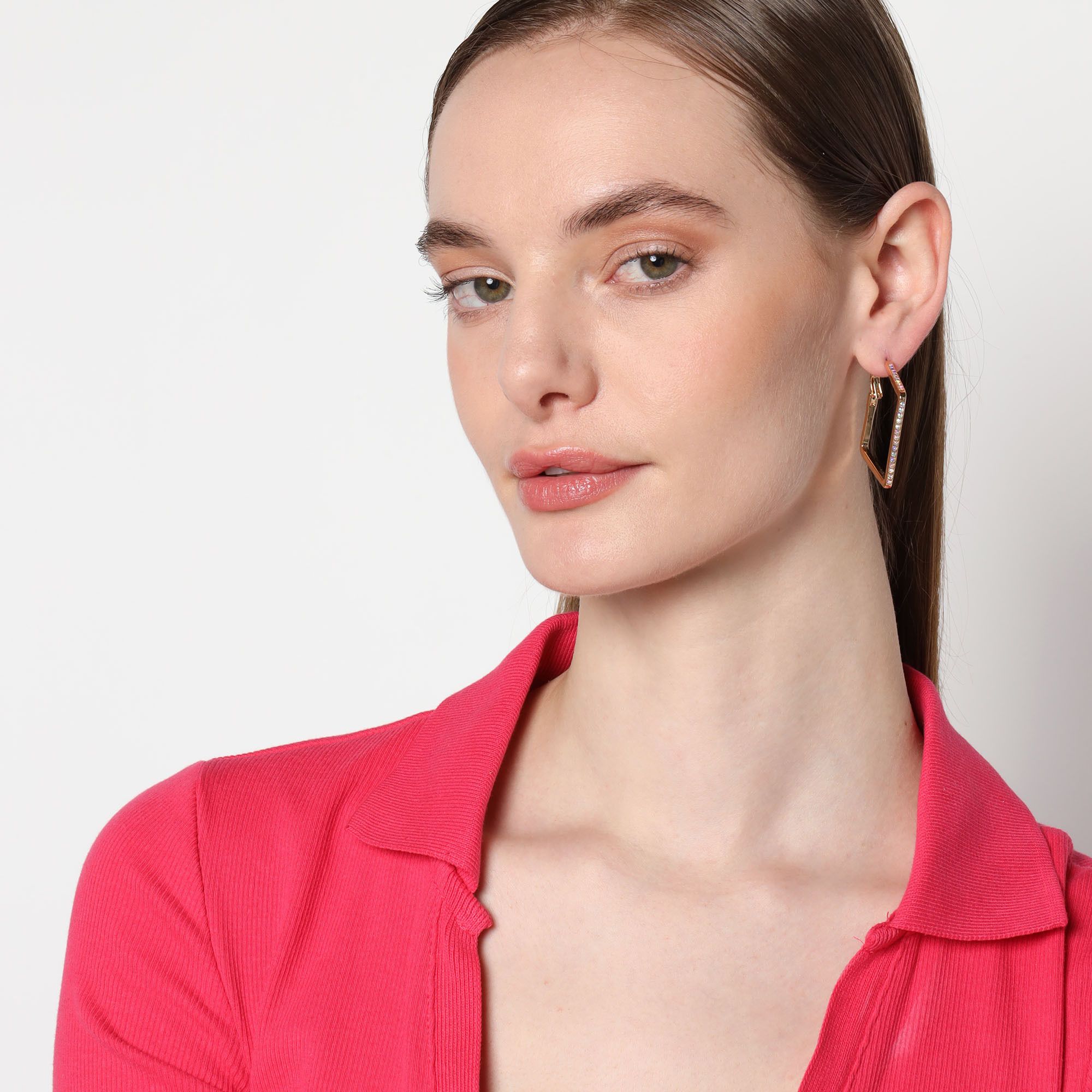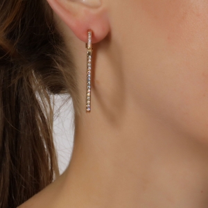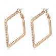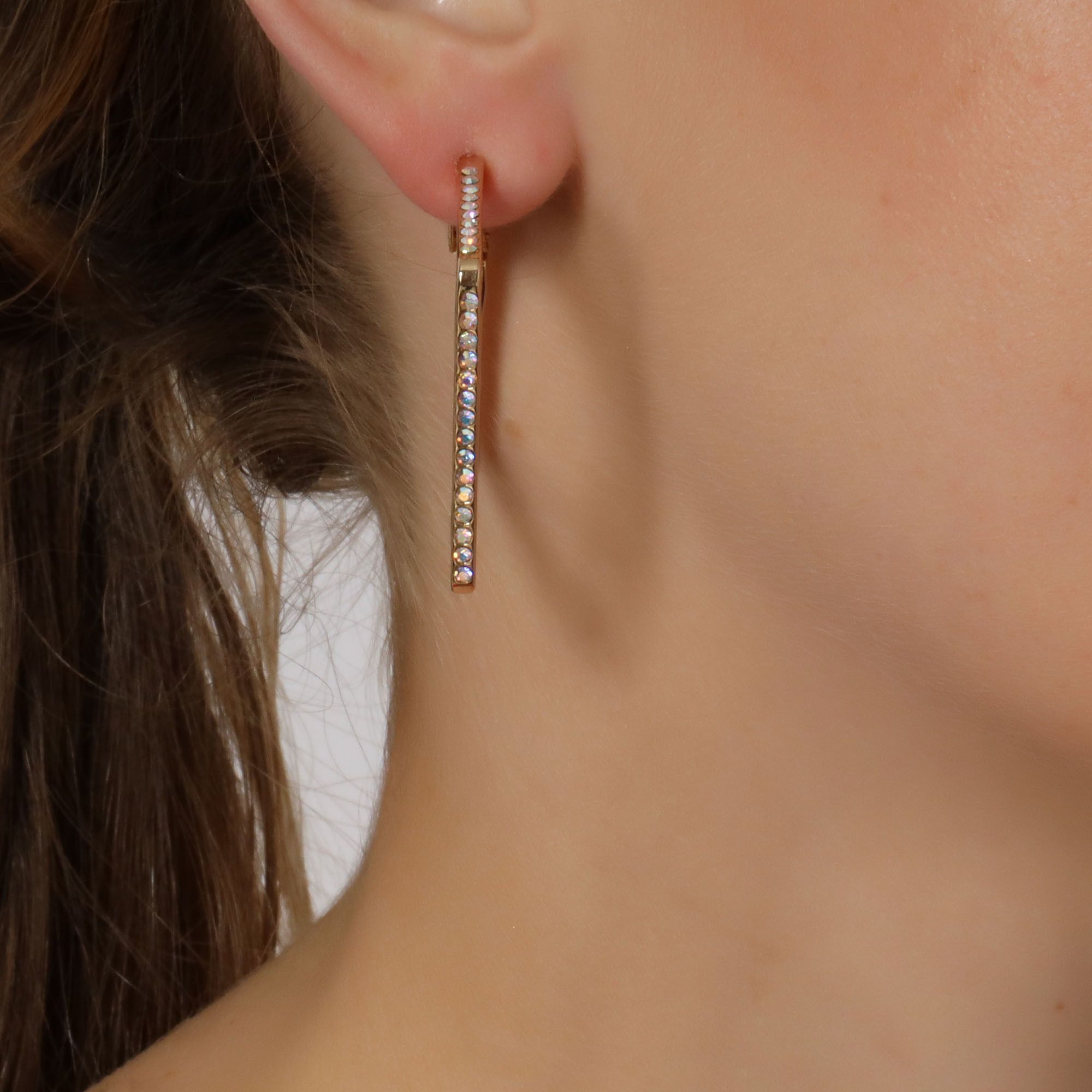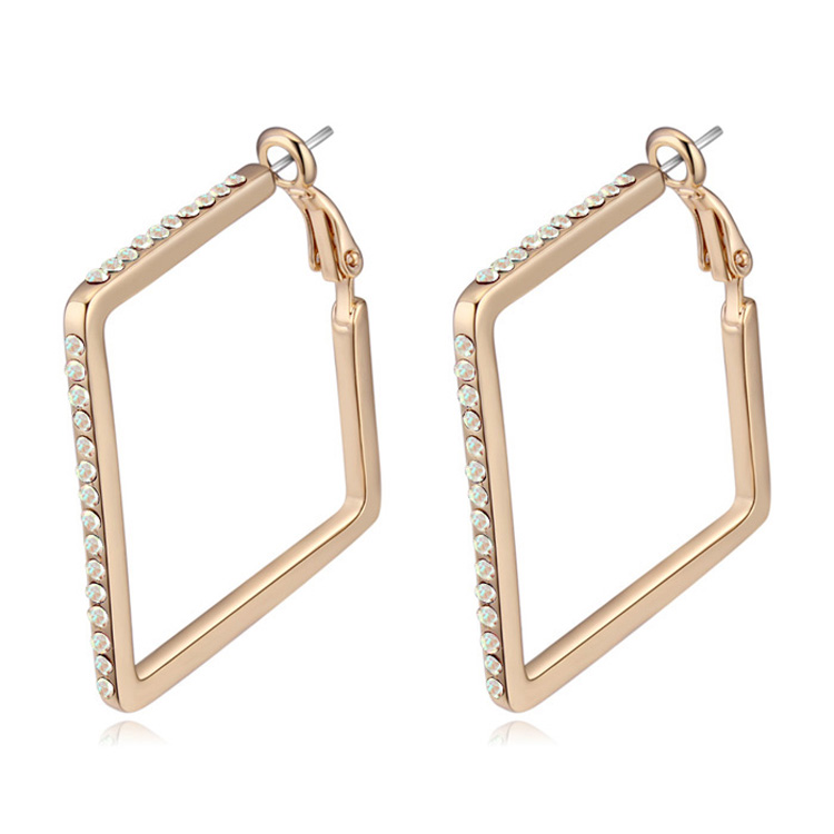 Preciosas arracadas en baño de oro amarillo de 18 quilates, elegante diseño cuadrado, con incrustaciones de cristales en color tornasol.