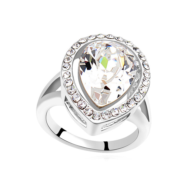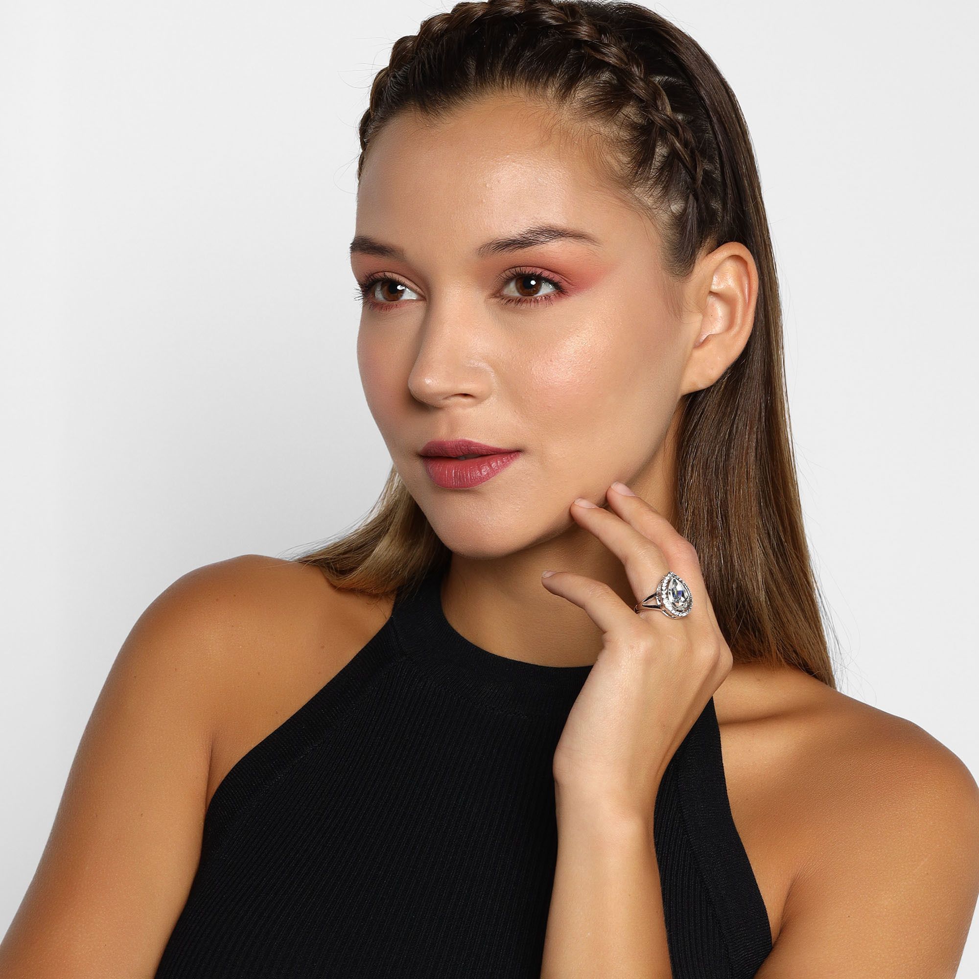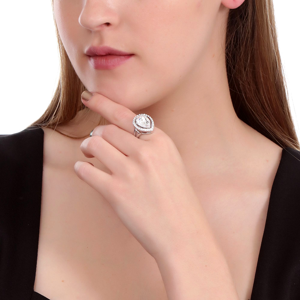 Lindo anillo en baño de oro blanco de 18 quilates, diseño de gota, con cristal blanco corte pera e incrustaciones de cristales en color blanco.