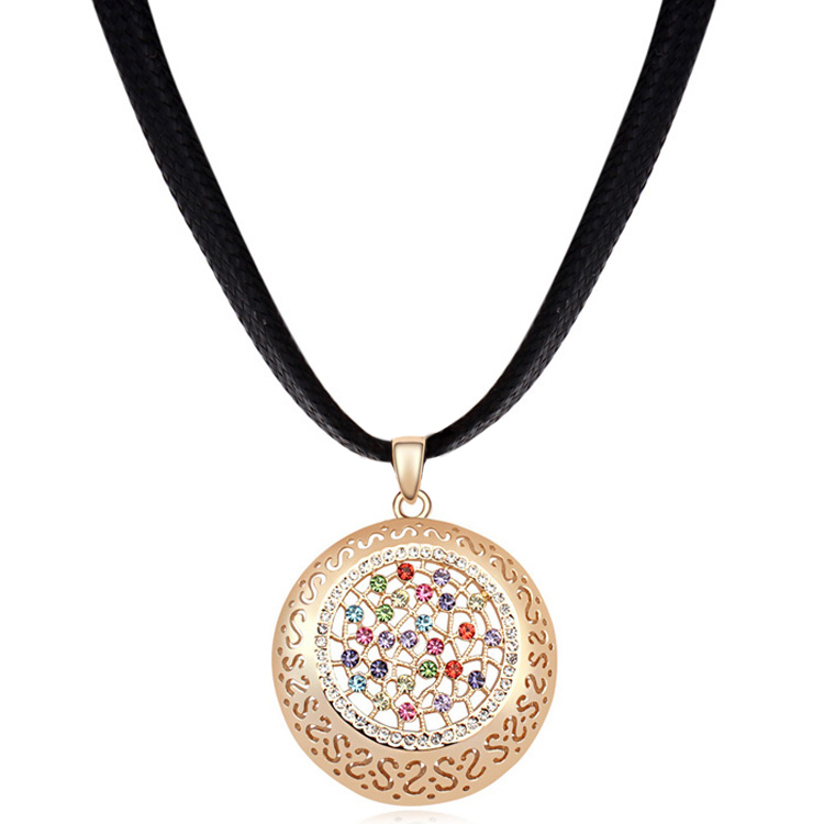 Collar en baño de oro amarillo de 18 quilates, elegante diseño circular, con grecas caladas e incrustaciones de cristales multicolores.