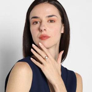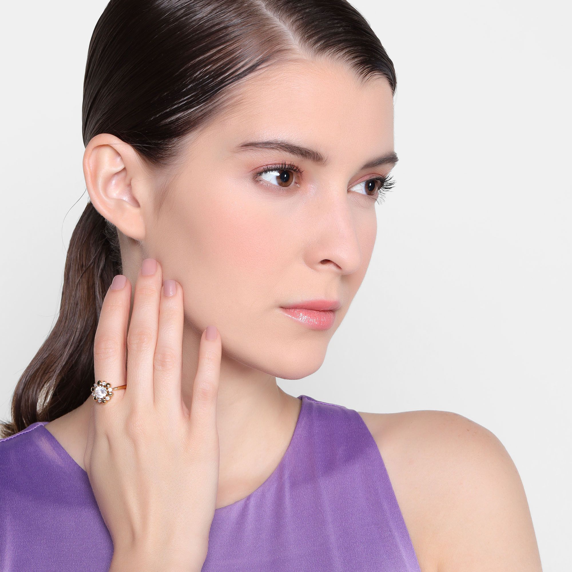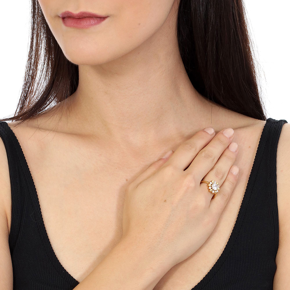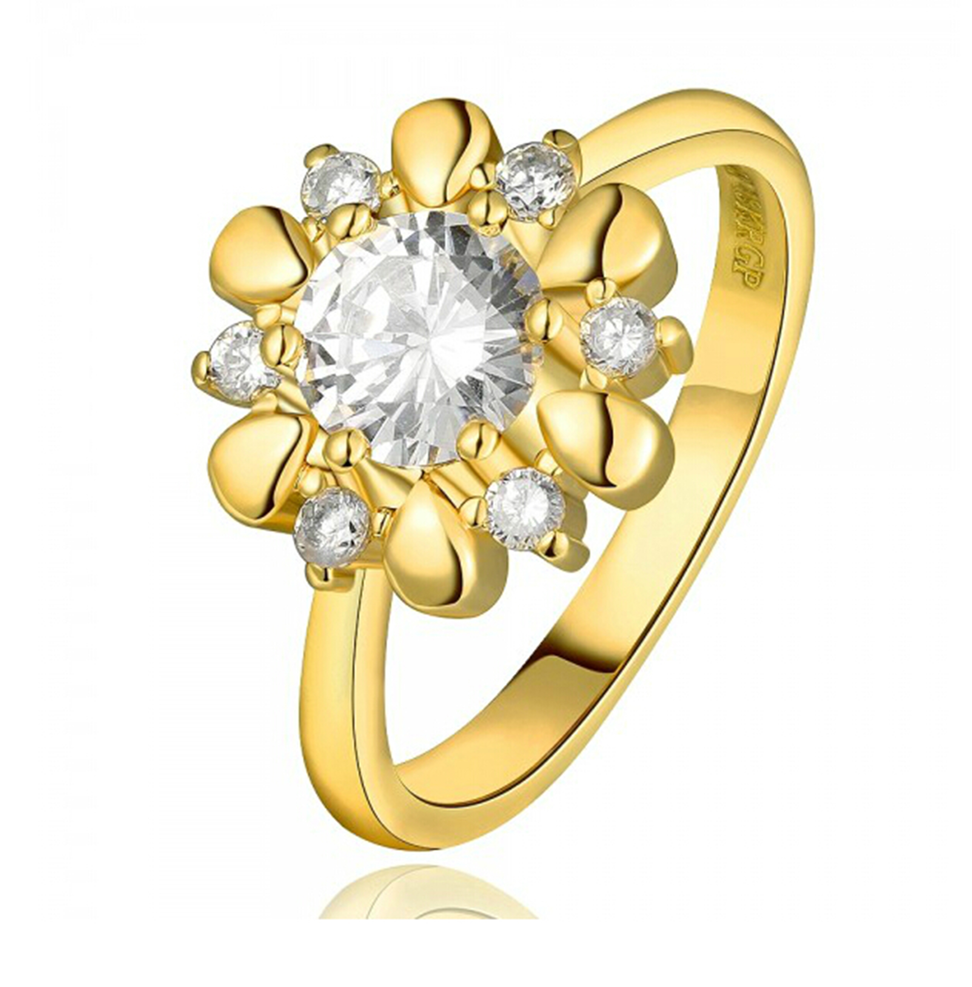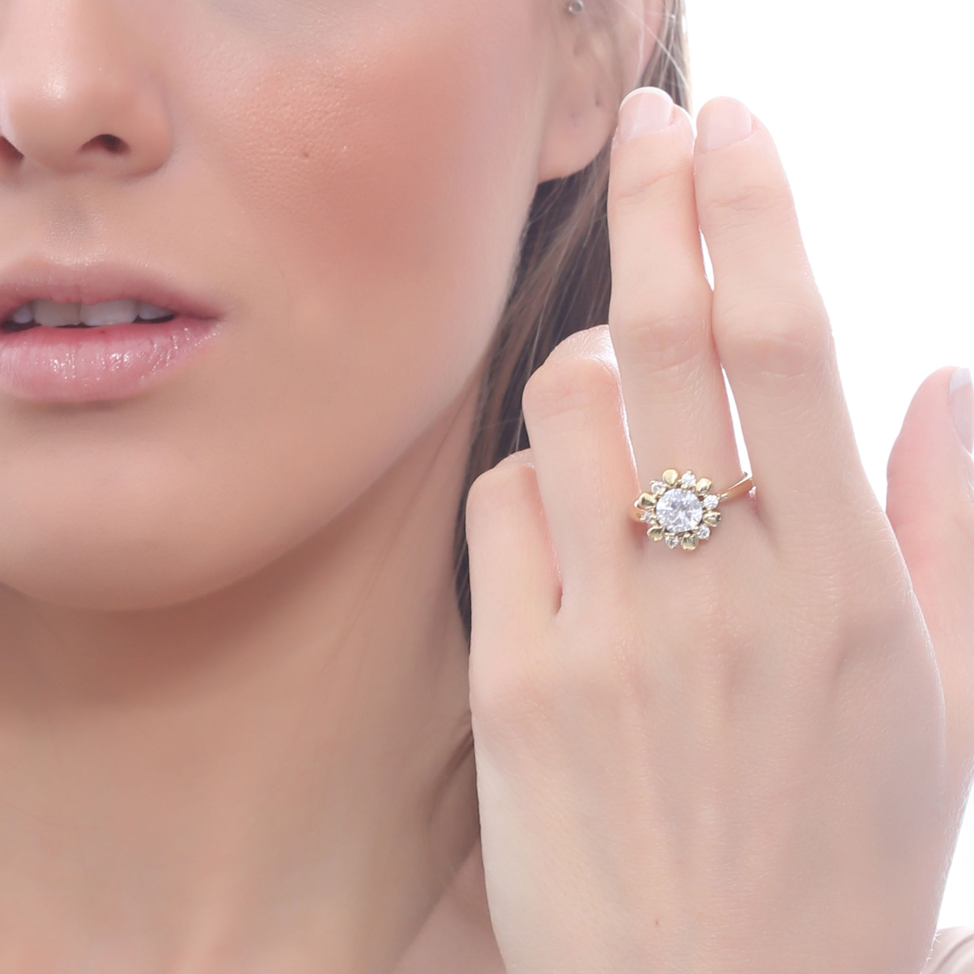 Precioso anillo en baño de oro amarillo de 18 quilates, diseño de flor, con cristal blanco corte brillante al centro e incrustaciones de cristales blancos.