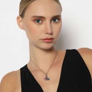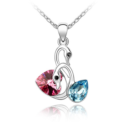 Dije con cadena en baño de oro banco de 18 quilates, diseño de cisnes con incrustación de cristales en color azul, rosa y negro. Fabricado en una estructura de aleación de platino con rodio sin níquel 1. joyería Hipoalergénica. 2. Incluye cajita de joyería. 3. Garantía de 30 días por defectos de fabrica.