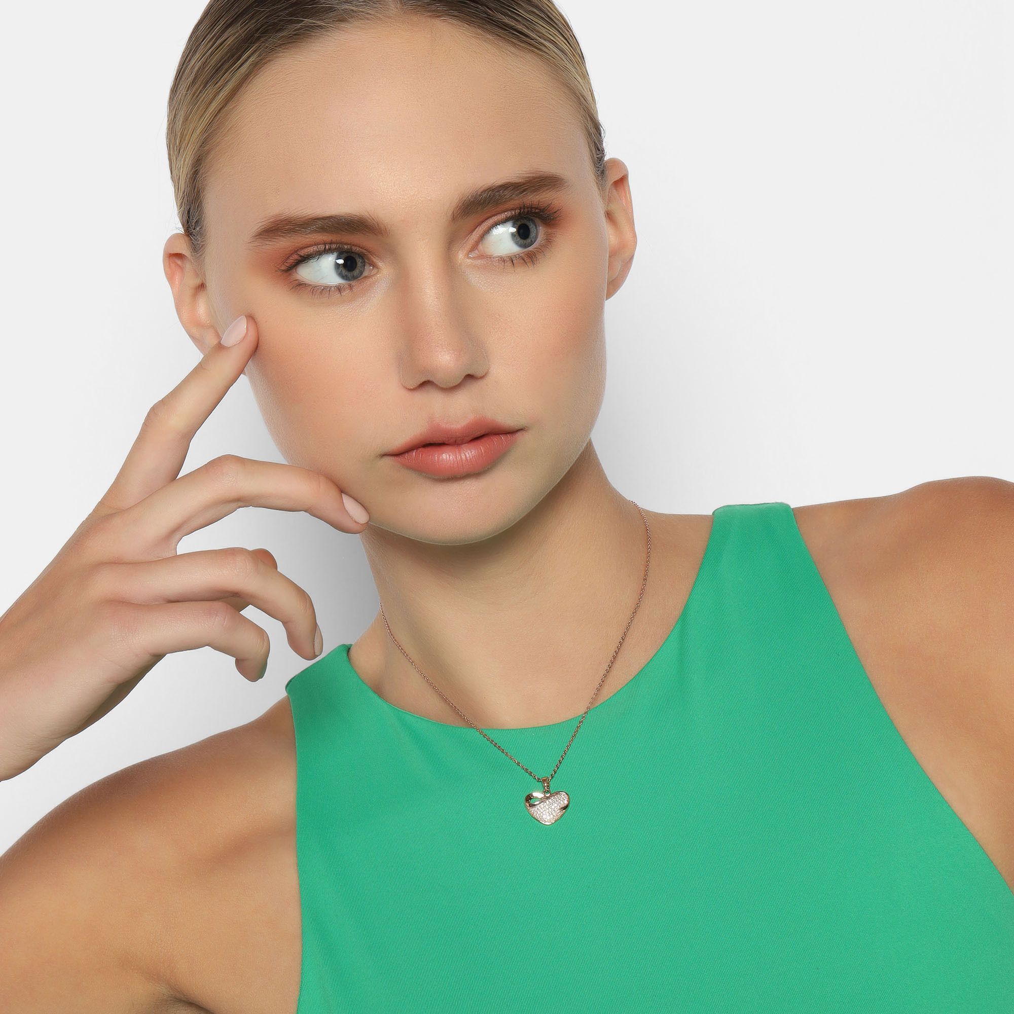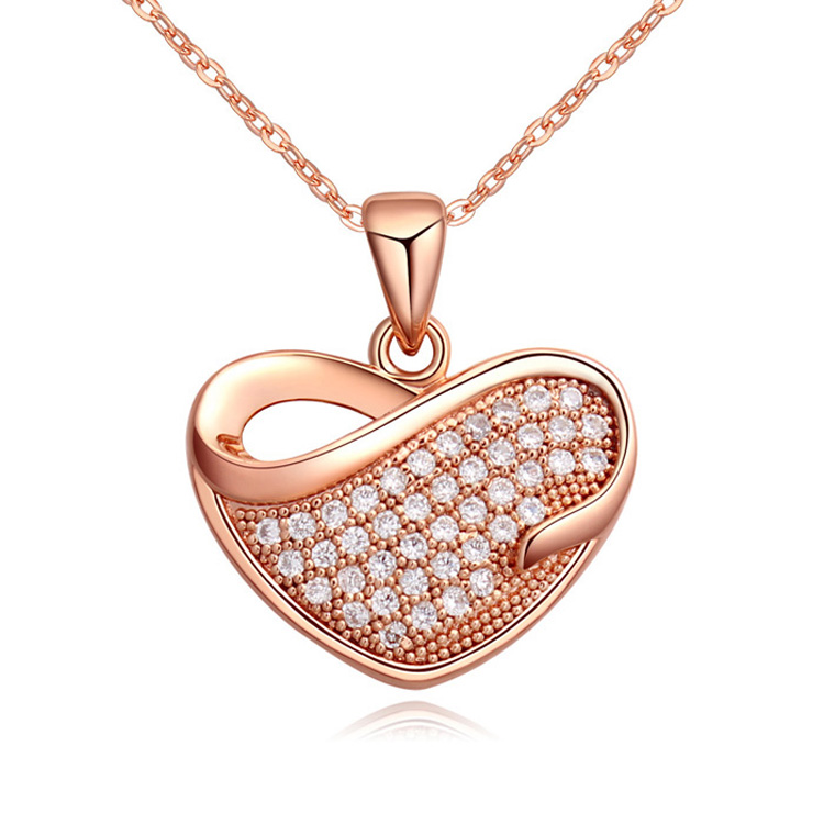 Dije en baño de oro rosa de 18 quilates, diseño de corazón con incrustación de cristales en color blanco.