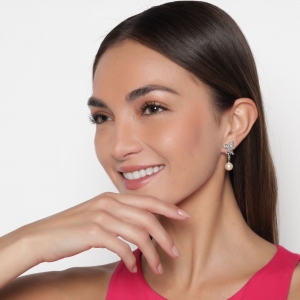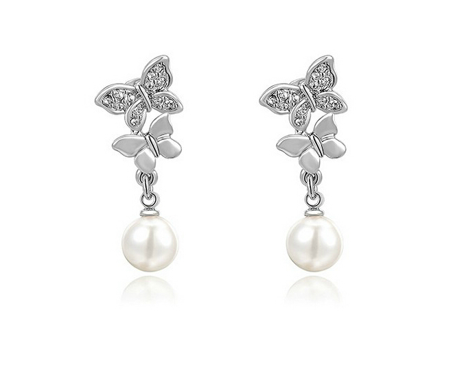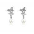 Aretes en baño de oro blanco de 18 quilates, fino diseño de mariposas con perla blanca e incrustaciones de cristales blancos.