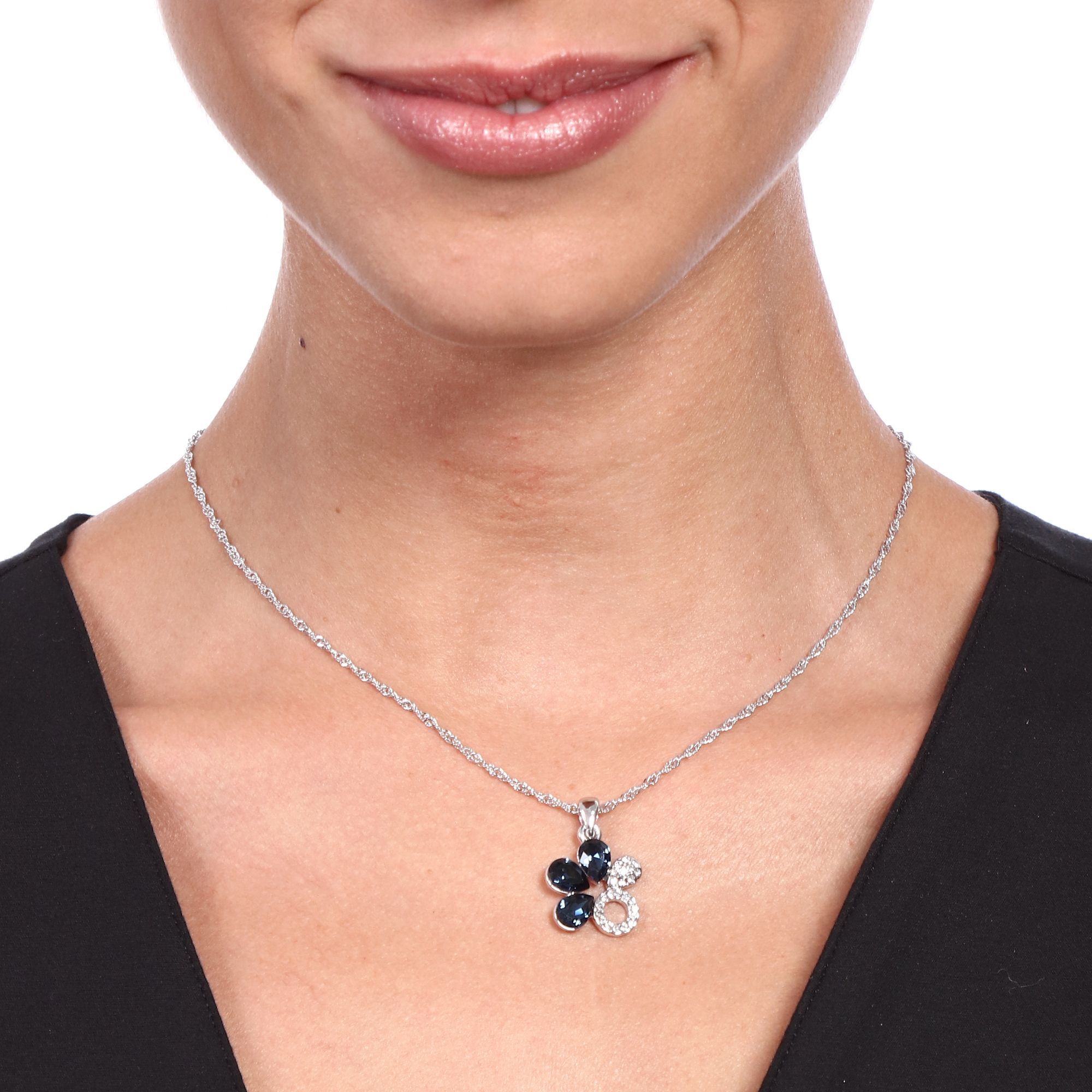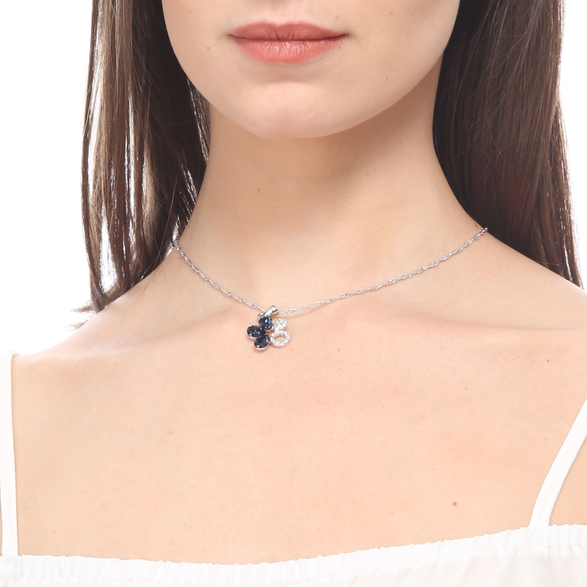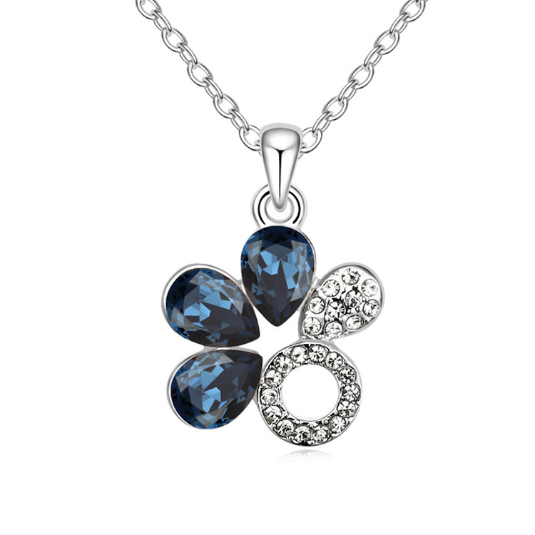 Dije en baño de oro blanco de 18 quilates, diseño de flor con incrustación de cristales en color azul y blanco. Fabricado en una estructura de aleación de platino con rodio sin níquel. 1. joyería Hipoalergénica. 2. Incluye cajita de joyería. 3. Garantía de 30 días por defectos de fabrica.