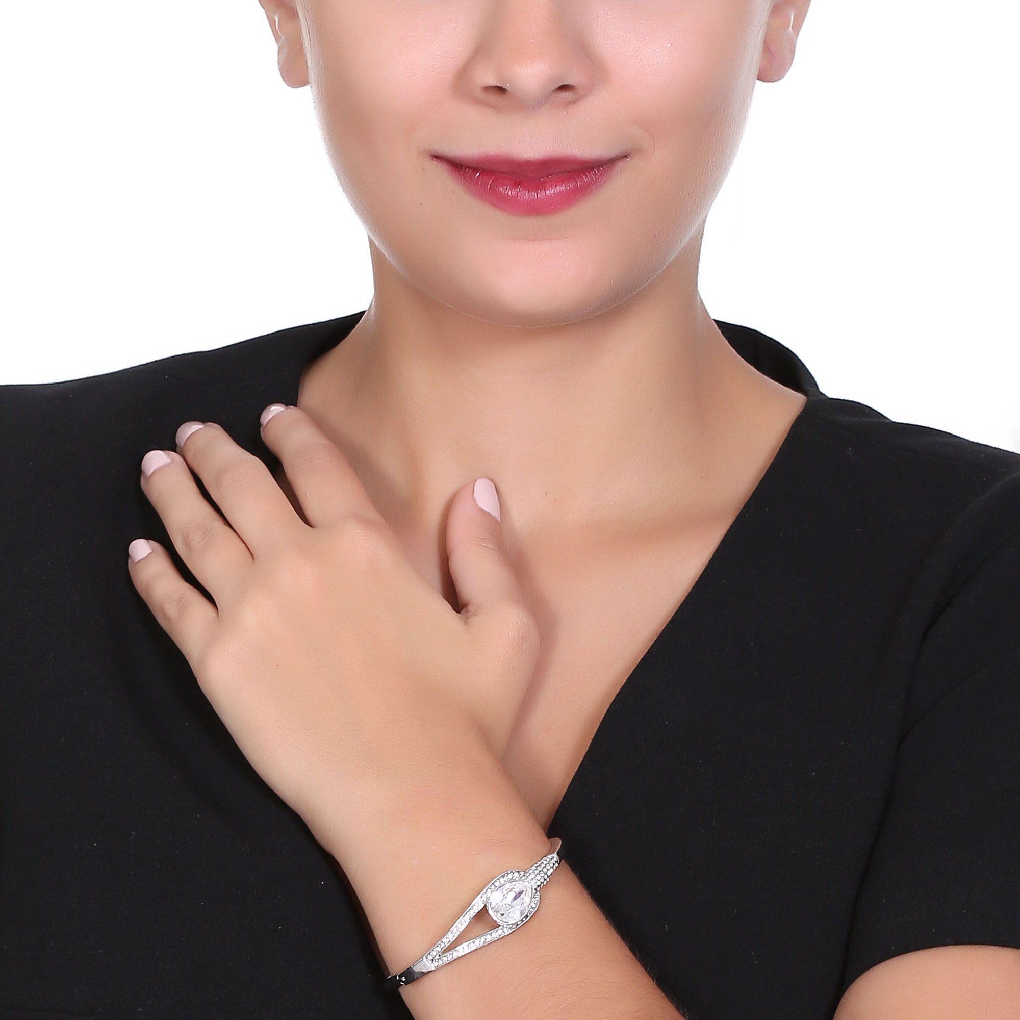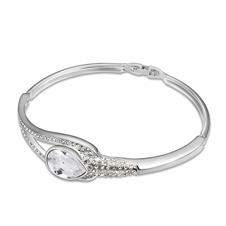 Brazalete en baño de oro blanco de 18 quilates, elegante diseño de gota, con cristal blanco corte pera e incrustaciones de cristales blancos.