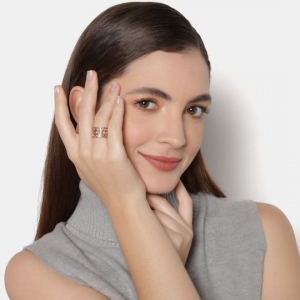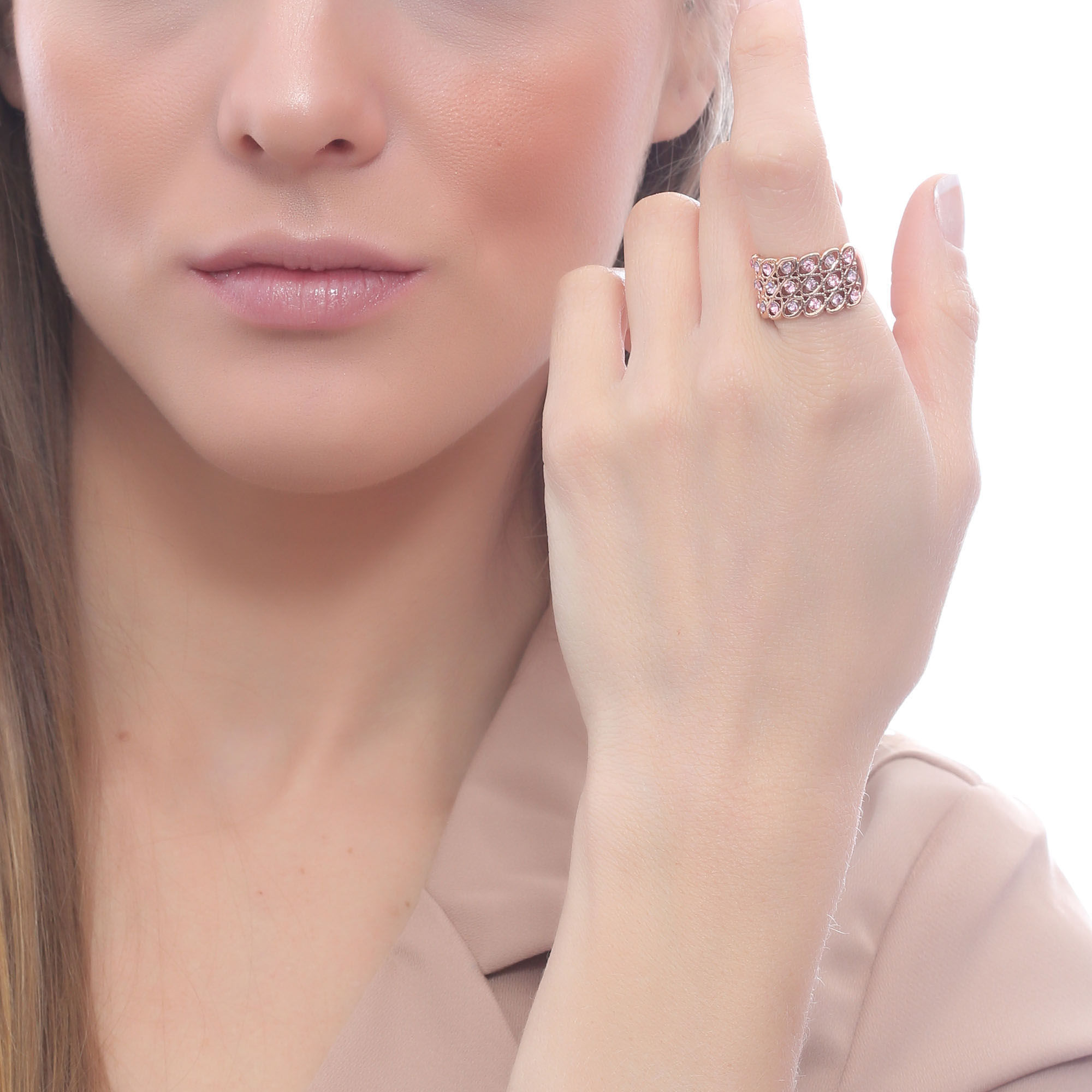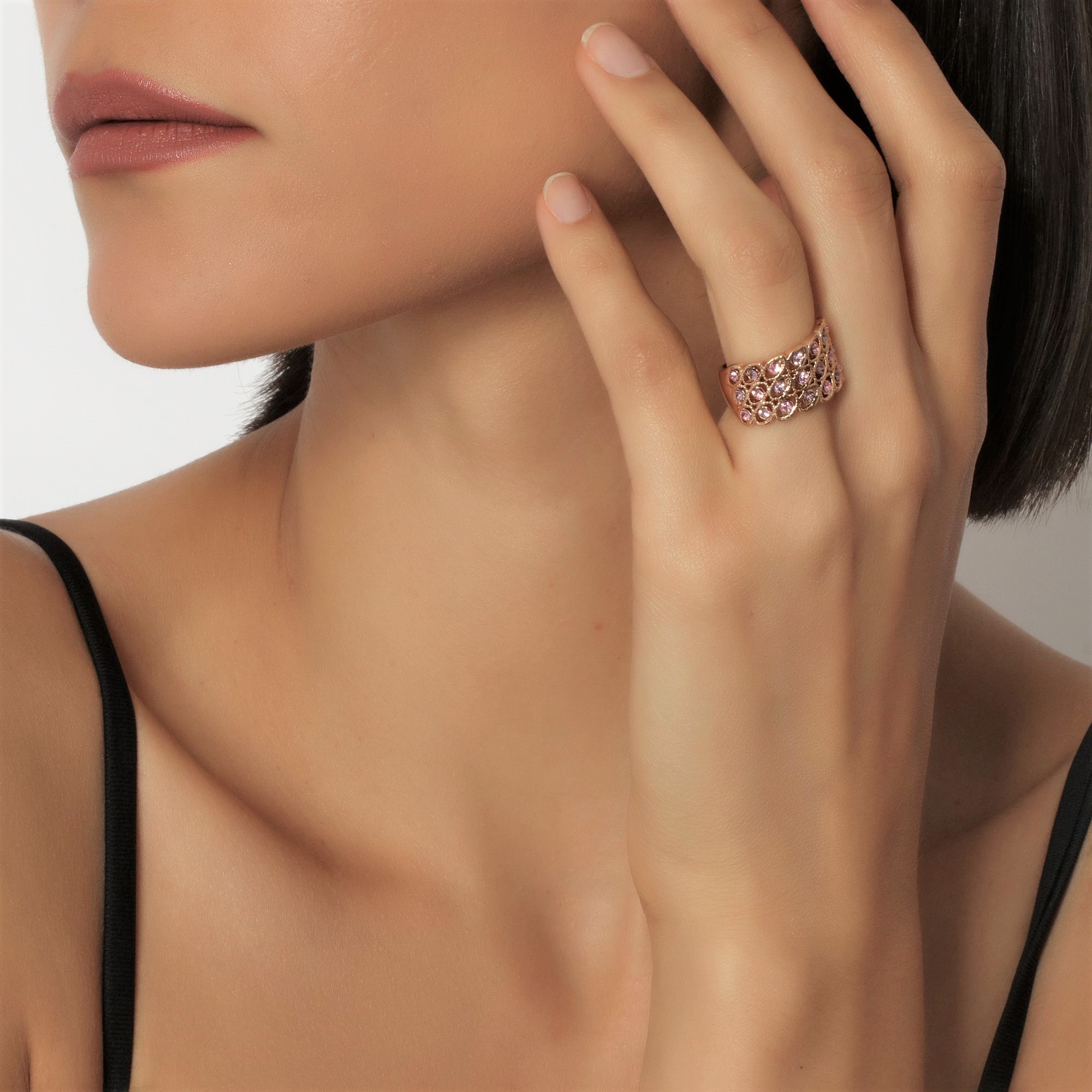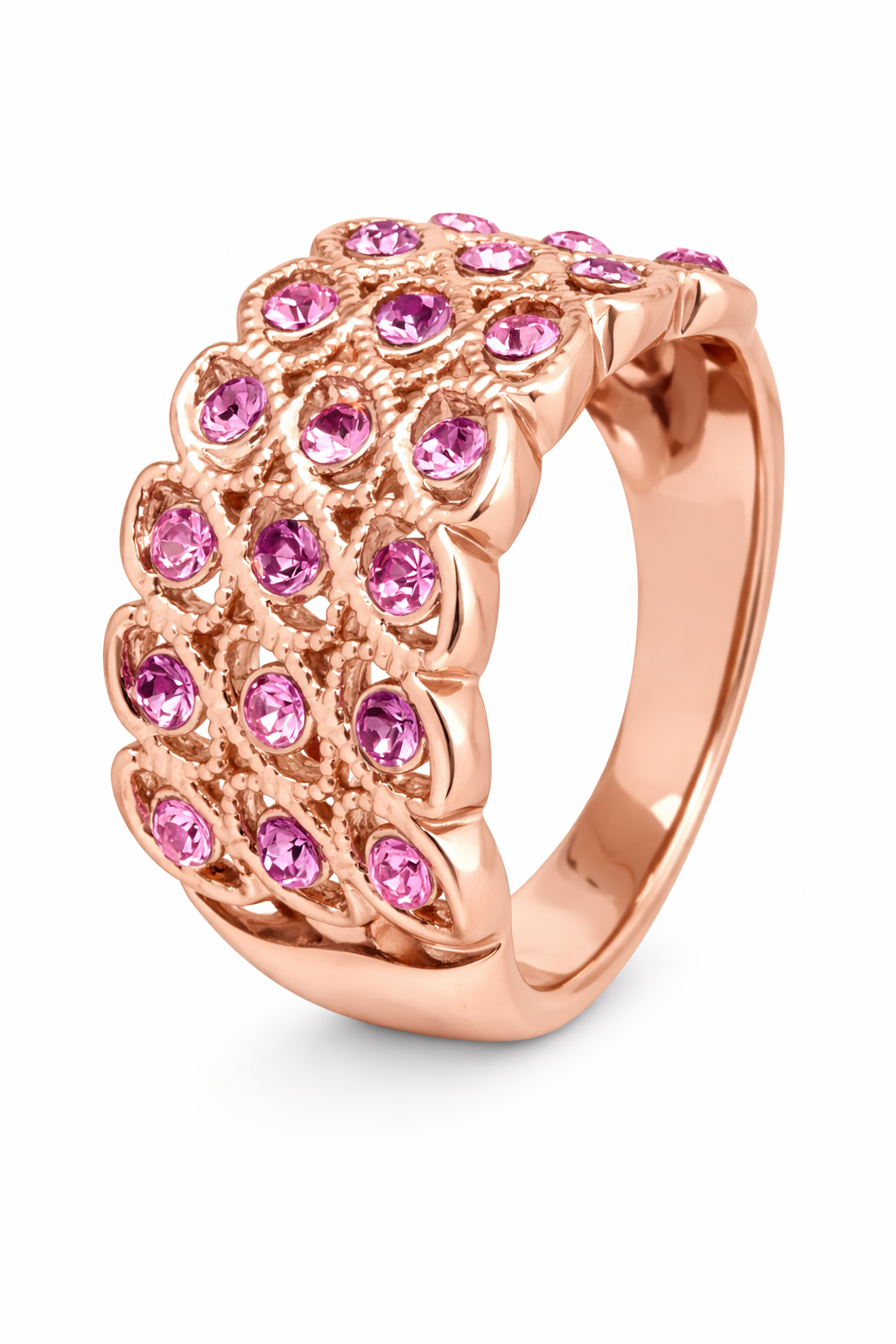Lindo anillo en baño de oro rosa de 18 quilates, fino diseño, de óvalos engarzados, con incrustaciones de cristales en colores.