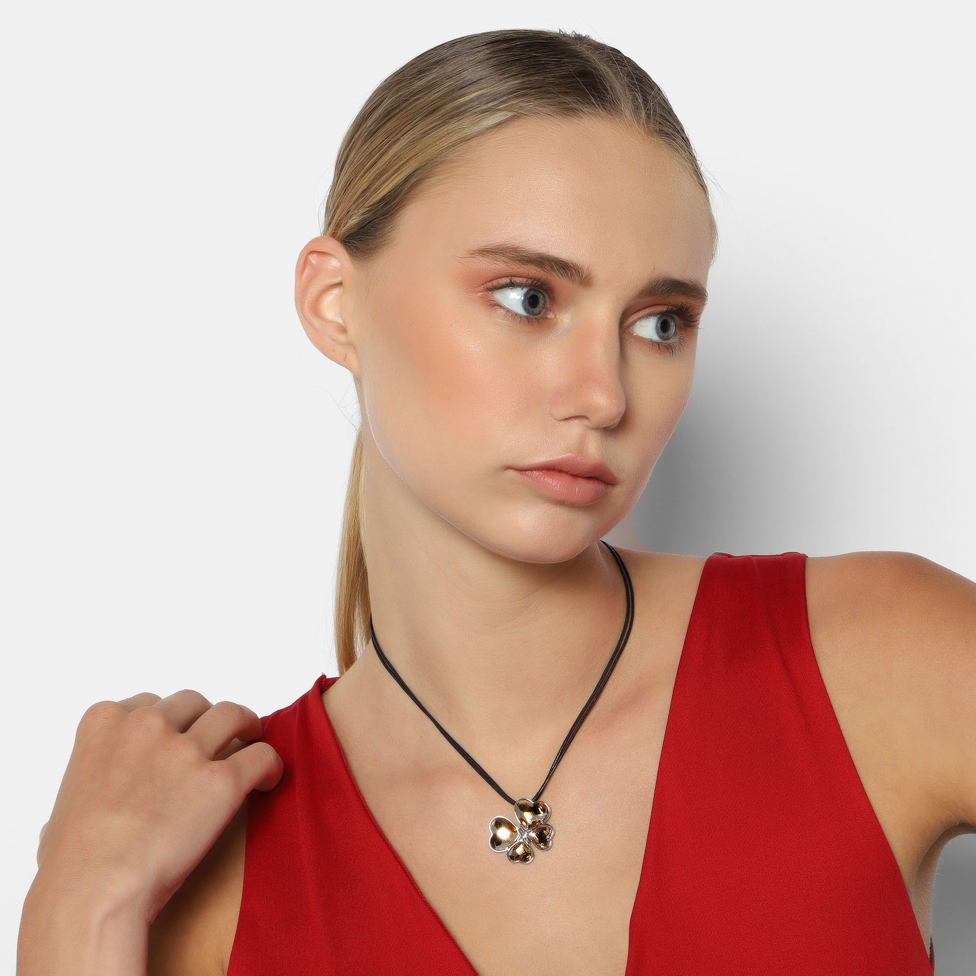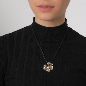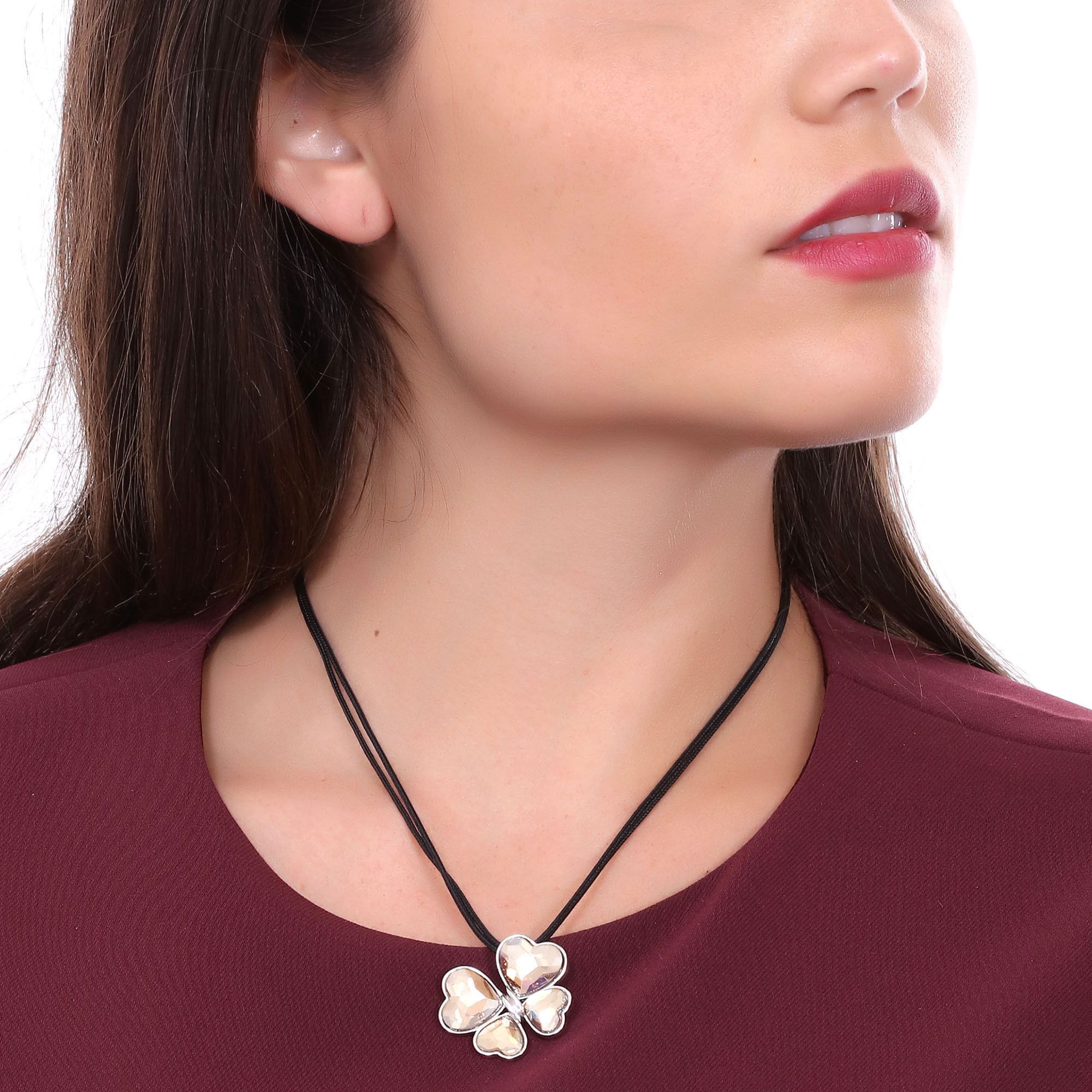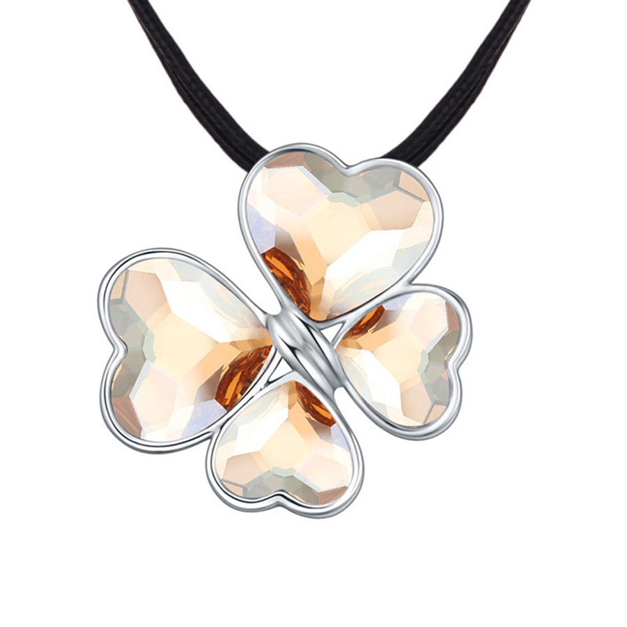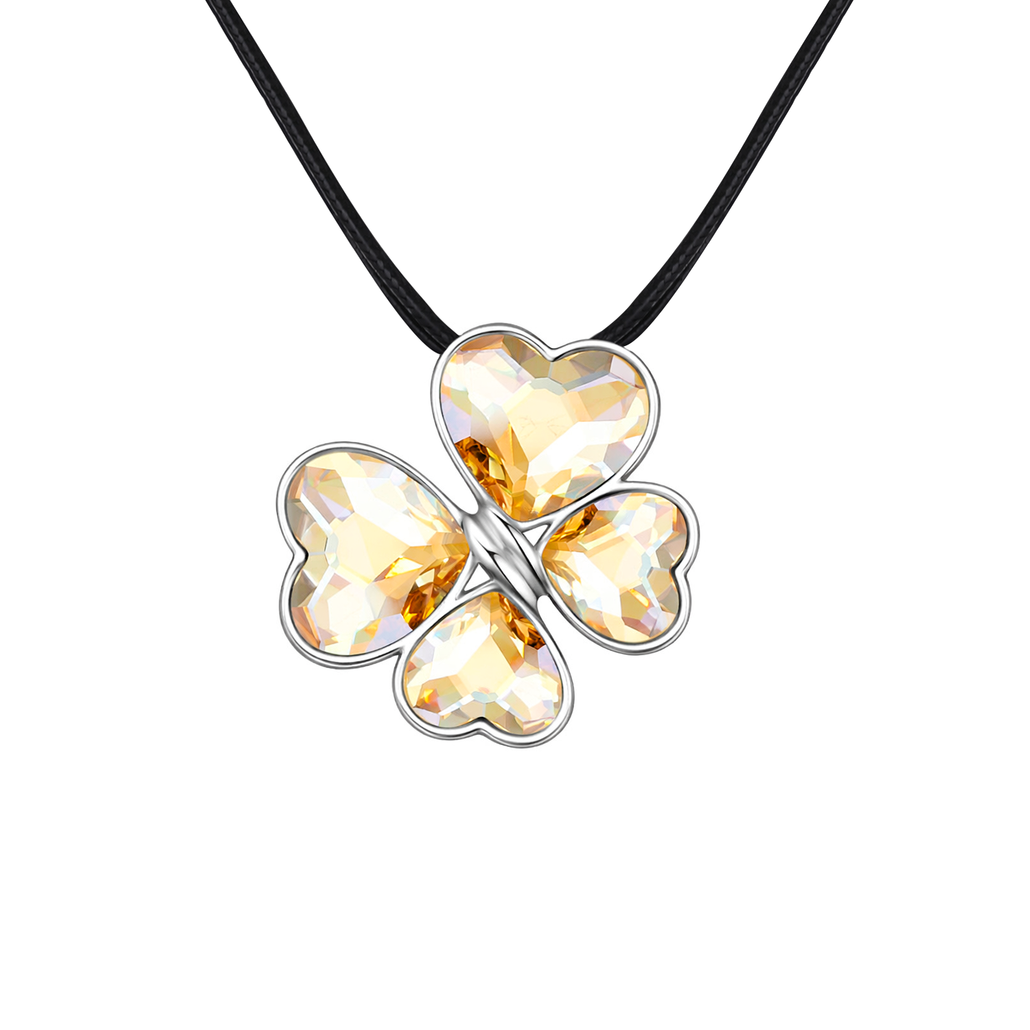 Precioso collar con detalles de baño de oro blanco de 18 quilates, diseño de mariposa con corazones de cristal ámbar y cadena de hilo reforzado.