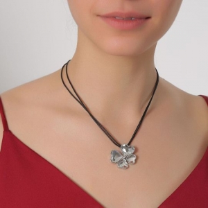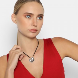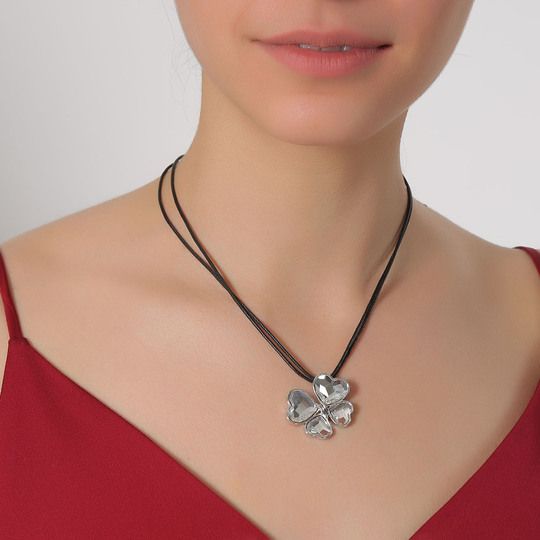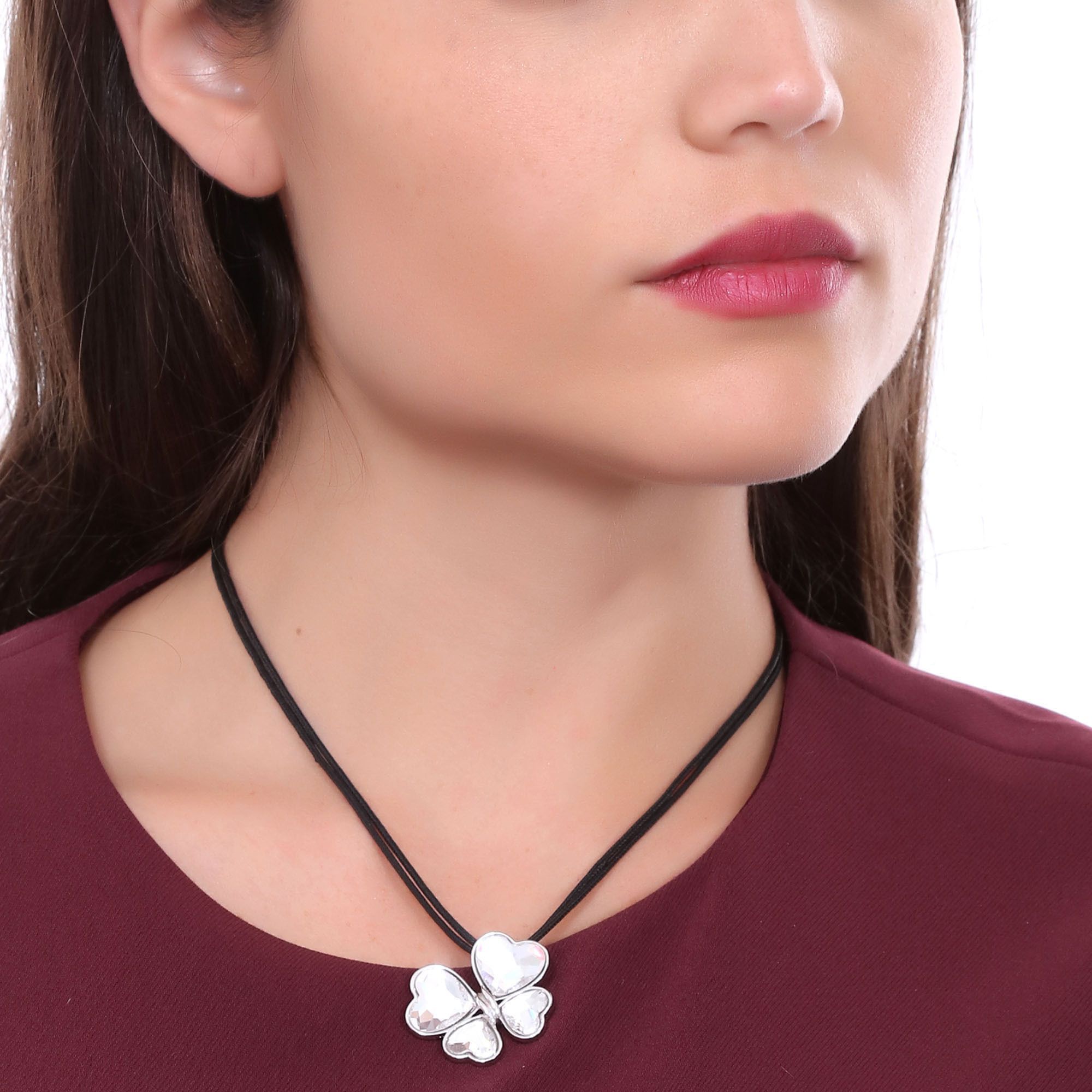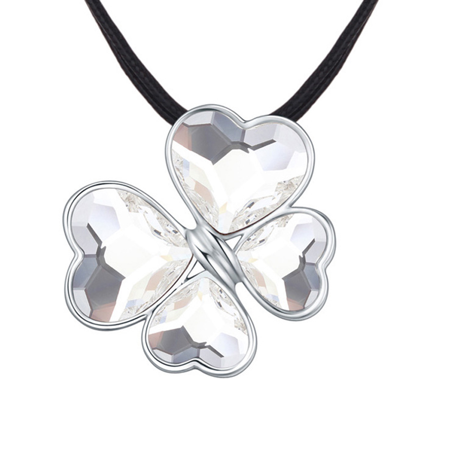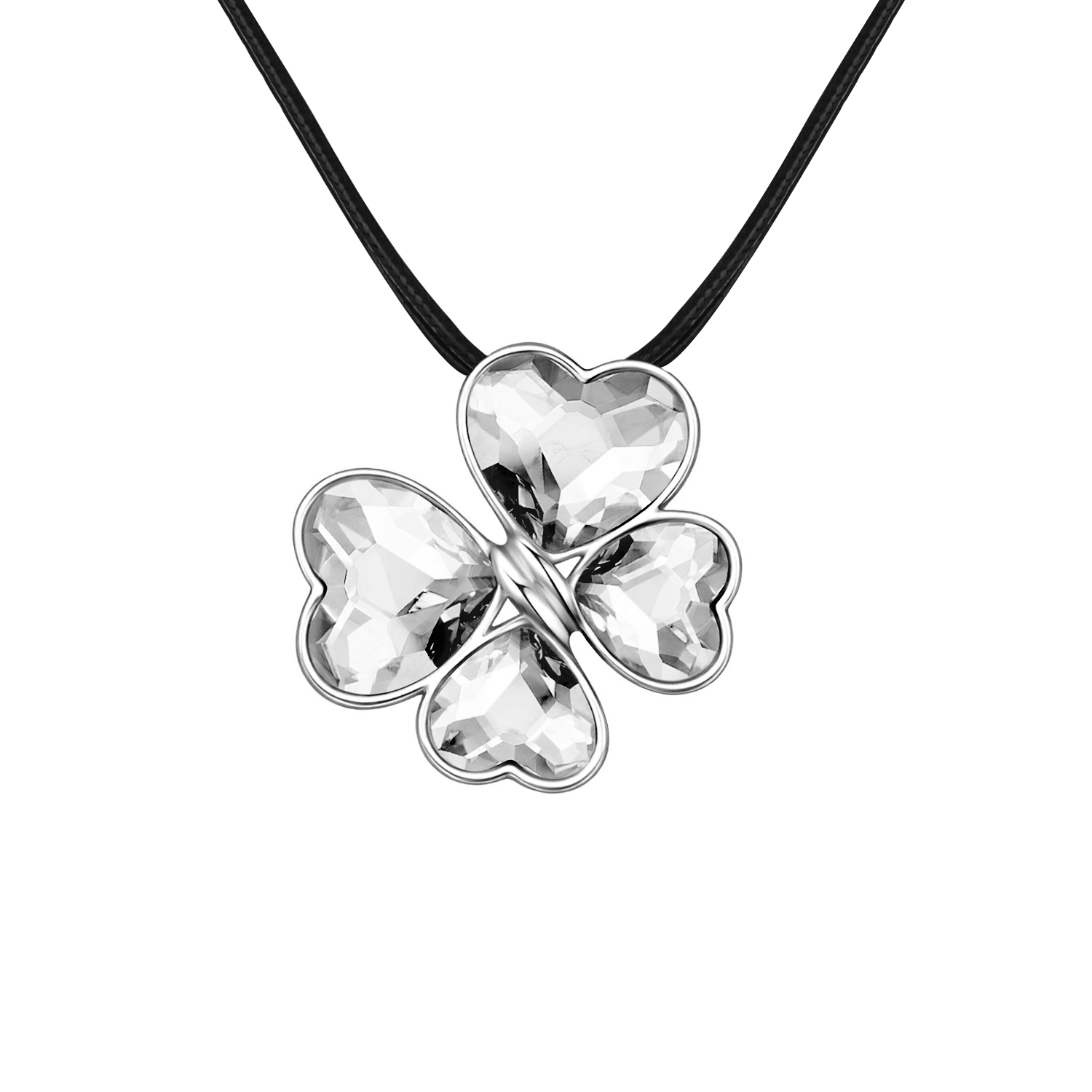Precioso collar con detalles de baño de oro blanco de 18 quilates, diseño de mariposa, corazones de cristal color blanco y cadena de tela reforzada.