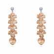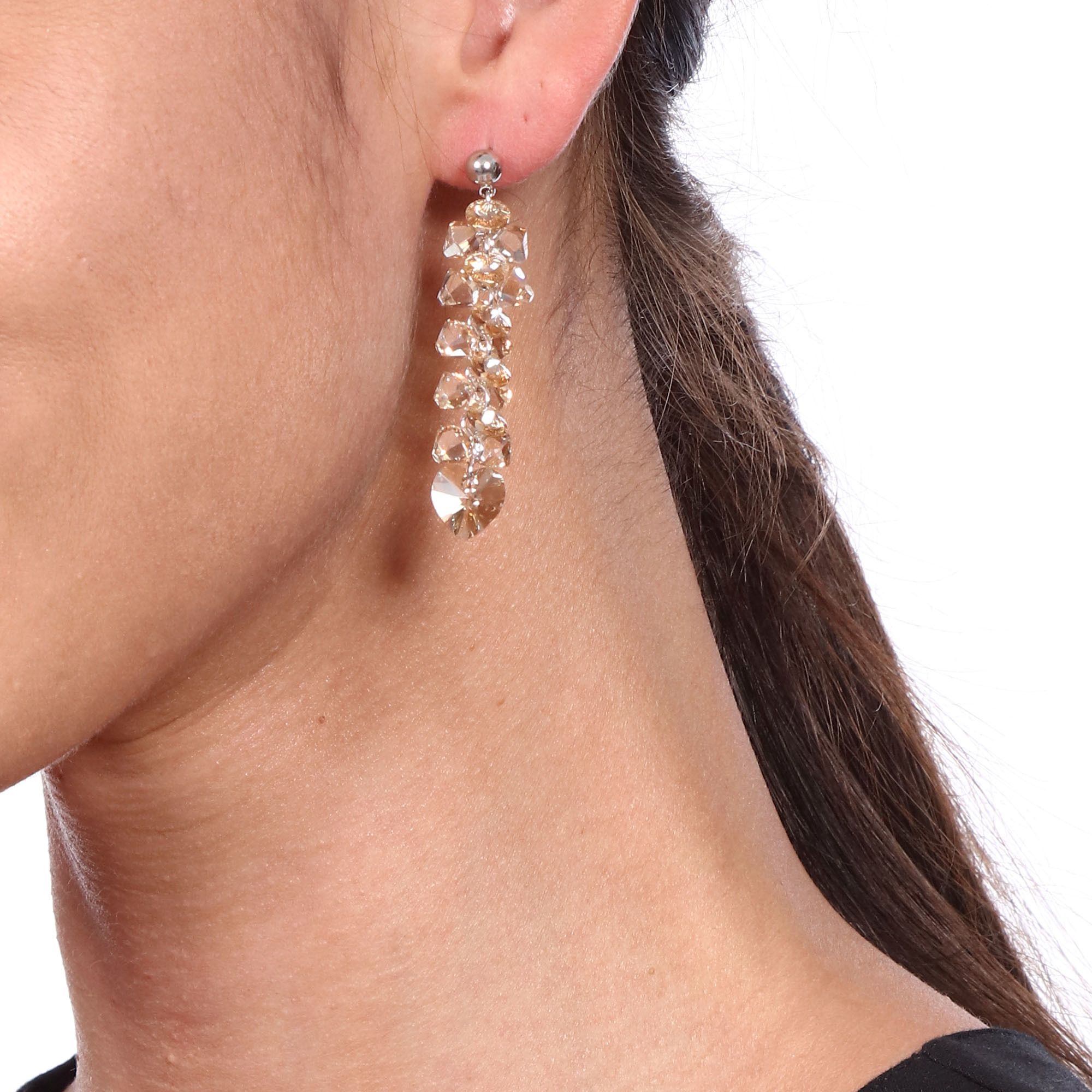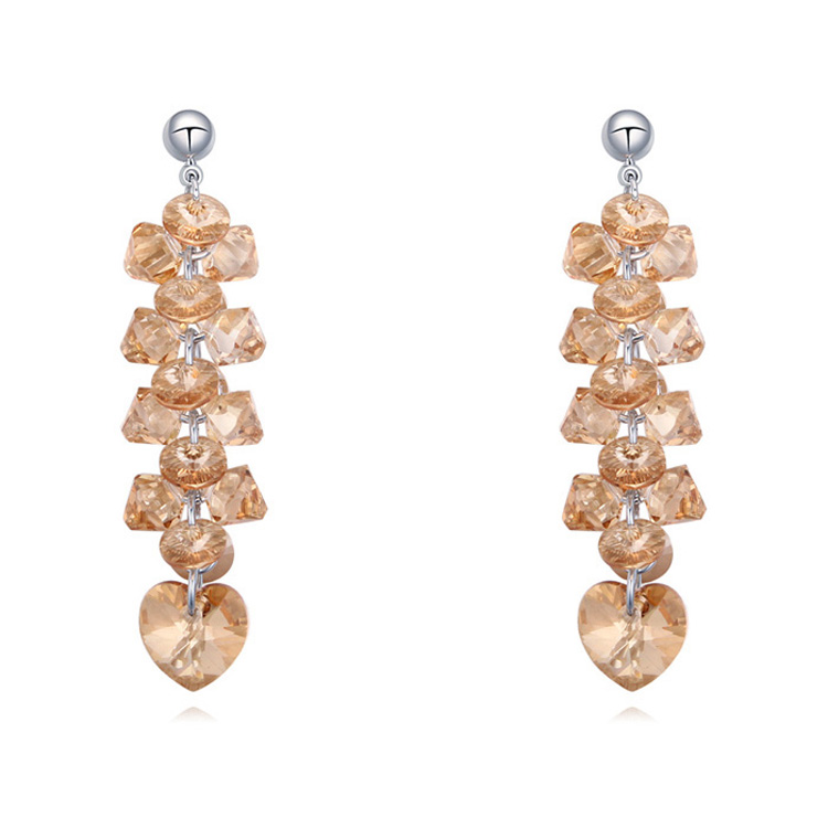 Aretes en baño de oro blanco de 18 quilates, fino diseño, con cristales color ámbar en cascada y corazón de cristal ámbar.