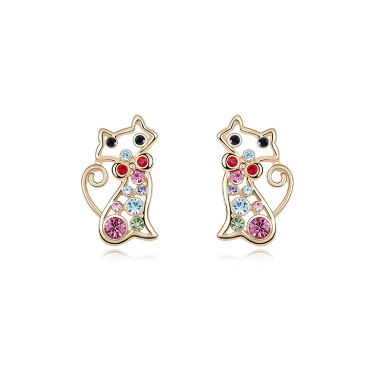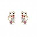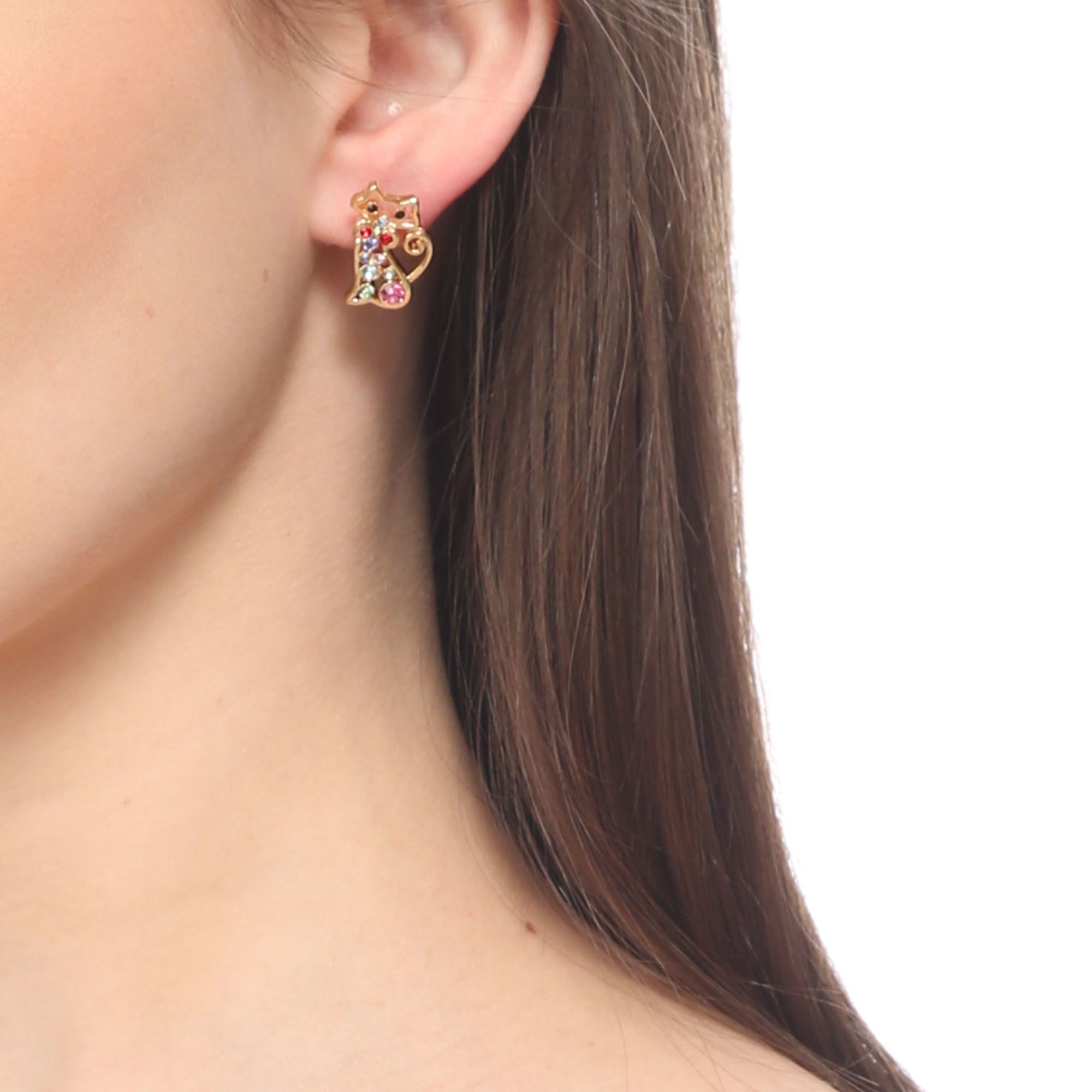 Lindos aretes en baño de oro amarillo de 18 quilates, diseño de gato con incrustación de cristales en colores. Fabricado en una estructura de aleación de platino con rodio sin níquel.