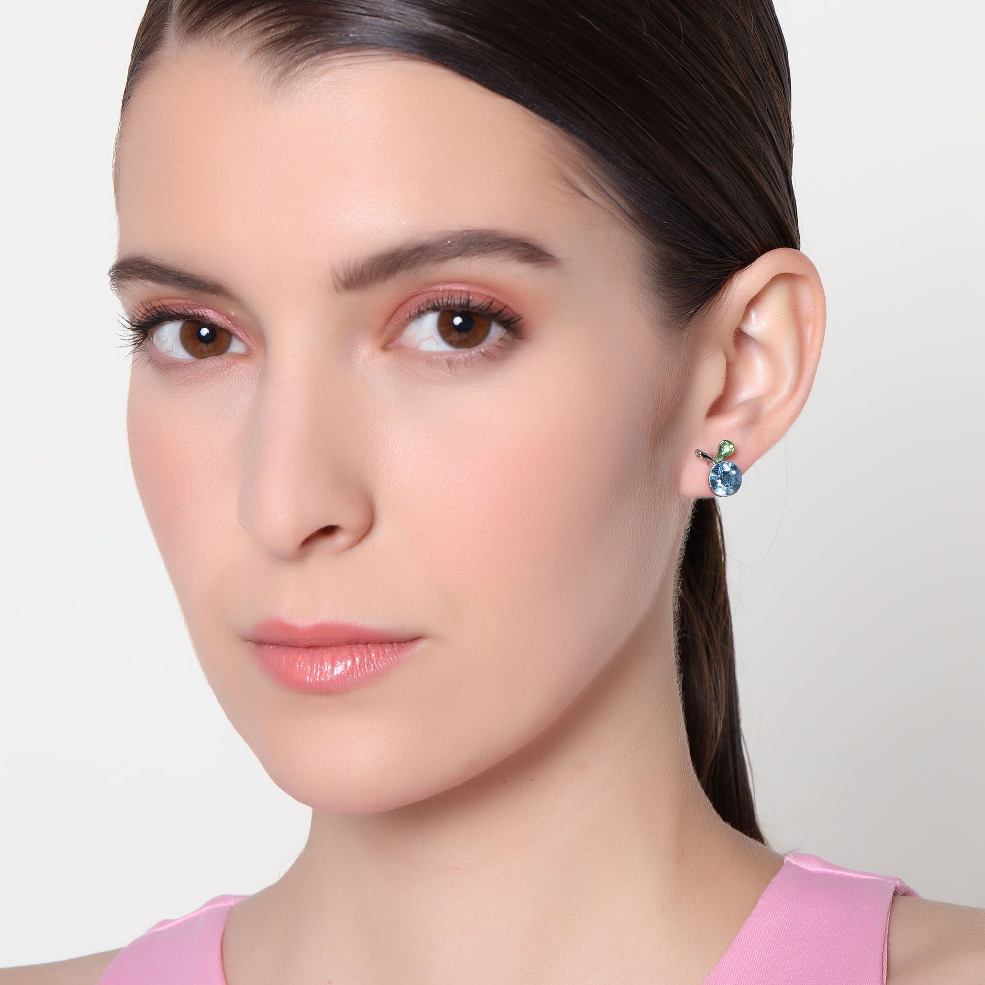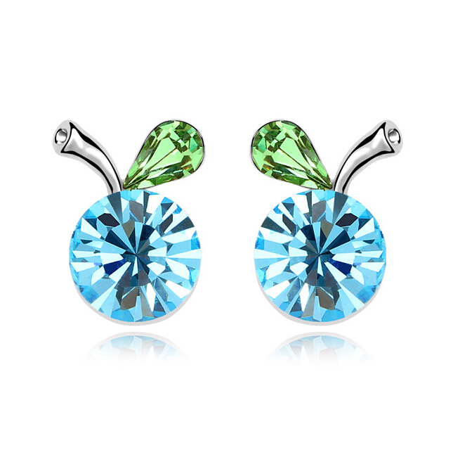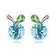 Lindos aretes en baño de oro blanco de 18 quilates, diseño de cereza con incrustación de cristales en color azul y verde.